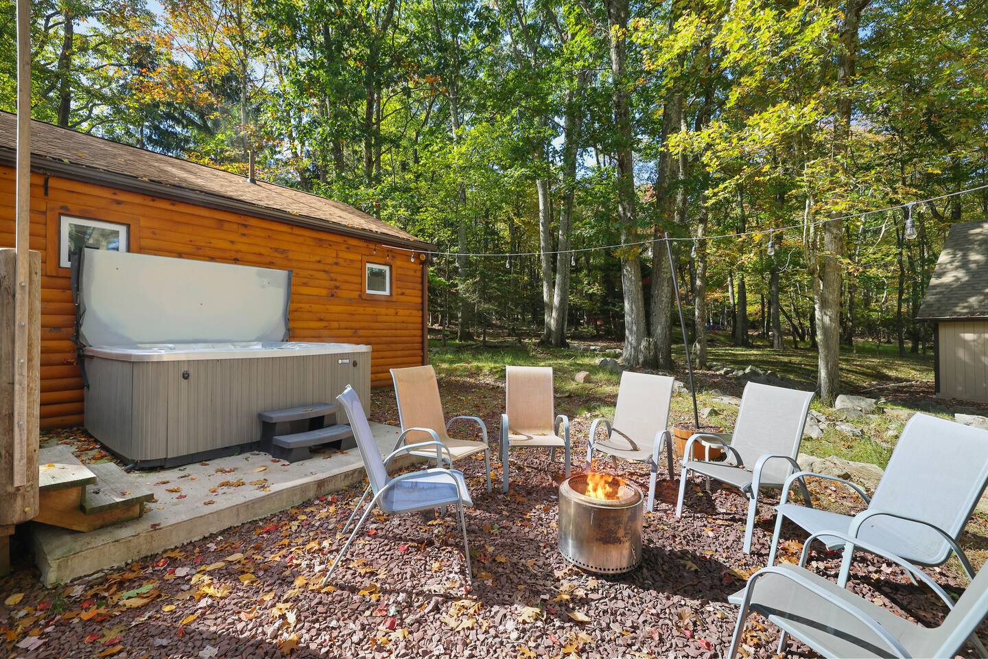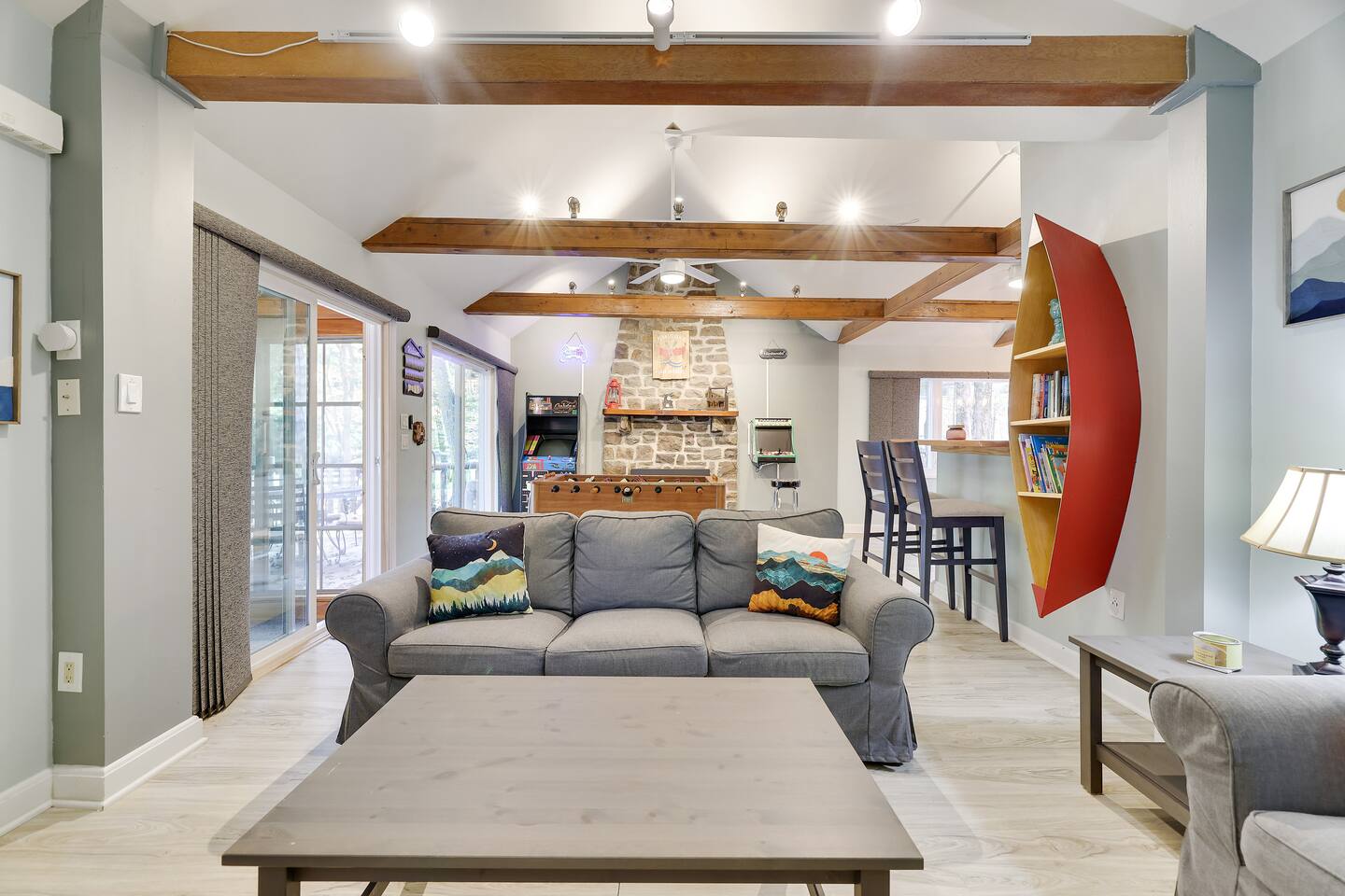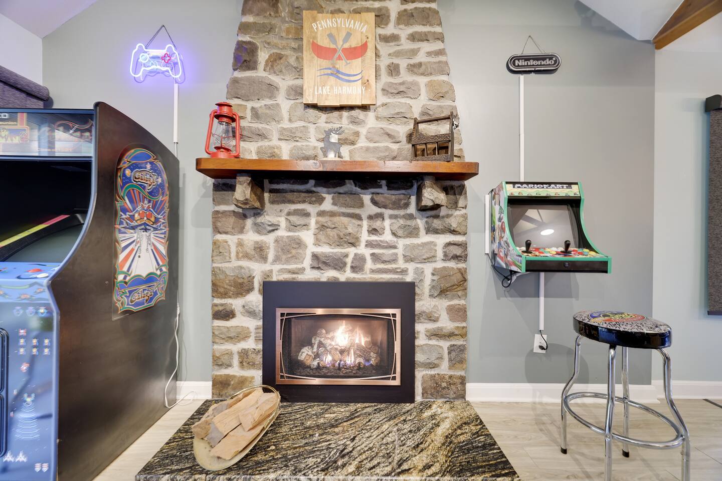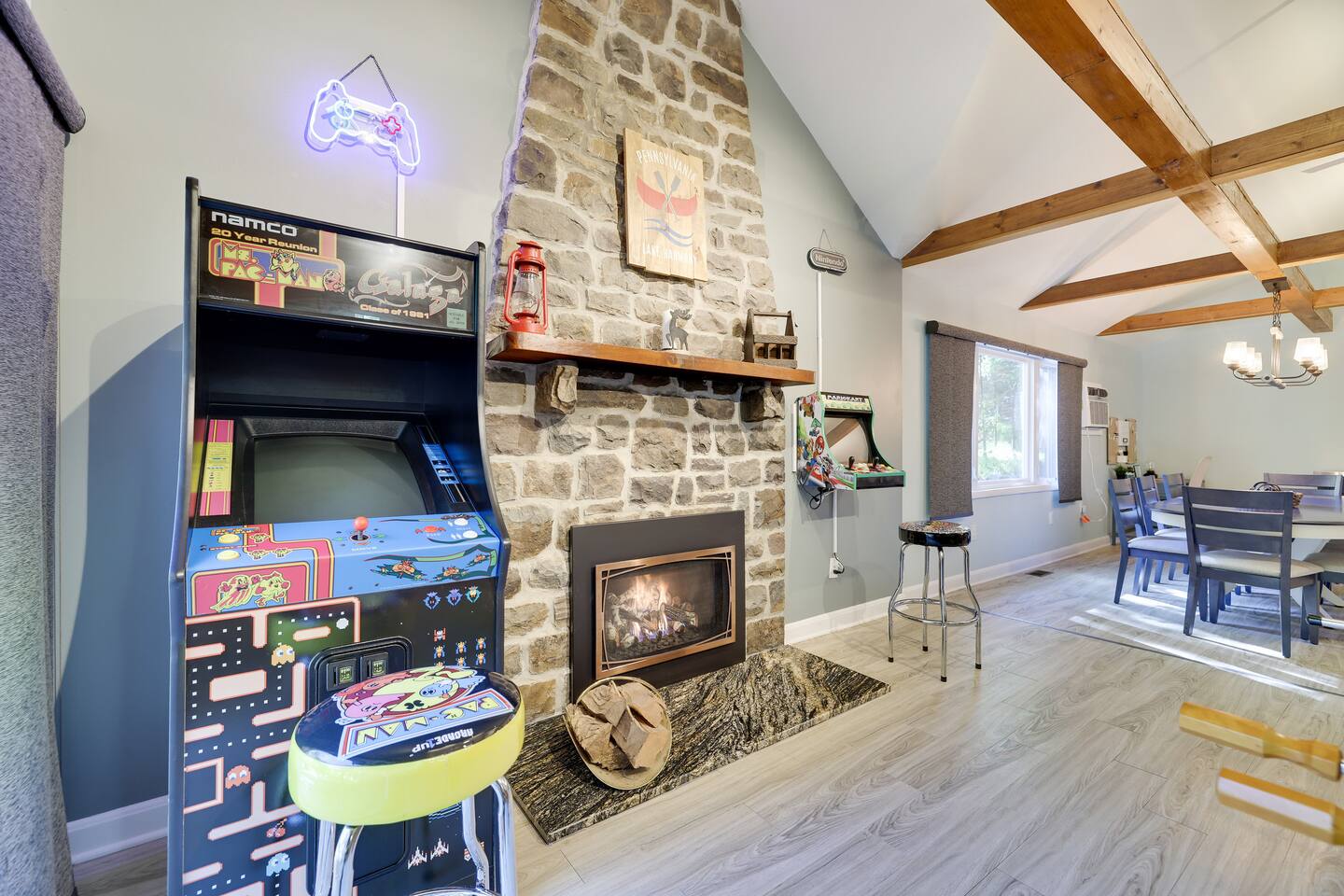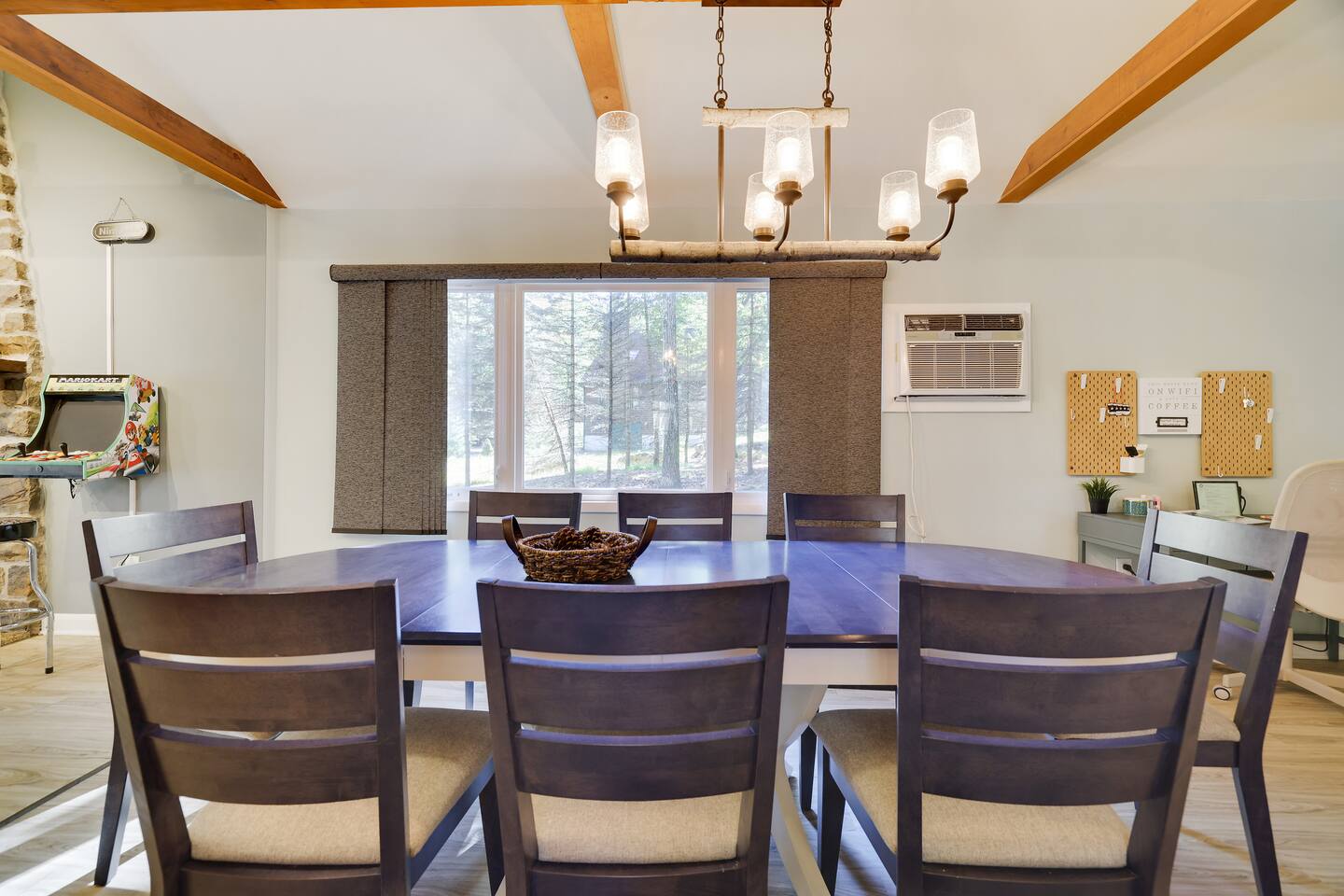 This gorgeous Log Cabin stunner will embrace you the minute you enter the 3-season front porch, telling you that "VACATION HAS STARTED!!" Bearfoot Bungalow is ranked top 5% based on our 54 reviews, you won't be disappointed! Living Space: No one is left out here - - with the fireplace and fun gaming area at one end of the living space and lots of comfy seating with 55" TV at the other end. Bring your vinyl records to play and great ready for a hot cup of coffee by the fireplace or some friendly arcade game competition Galaga & PacMan on one console and a few THOUSAND games from the 80's and 90's on the other! If video games aren't you thing, pick your teams for some Foosball or one of many board games available. Kitchen & Dining Space: The open concept with vaulted ceilings and exposed beams really give you the feeling of the mountains. Our Dining table will easily seat all 8 guests for any meal you decide to cook from the well- appointed kitchen. We have everything necessary to cook a slammin' pancake breakfast or steak dinner... you decide! Bathrooms: We take great pride in presenting a clean, fresh space for you. You will appreciate the beautiful bathrooms with huge glass door showers, multi shower heads (there is a his and hers in the master bath) dimmable mood lighting, even a bidet in the master bathroom! Bedrooms: All Bedrooms have AC! Bedroom 1~We offer a bedroom with a Cherry Wood Bunk that is Full over Full, closet, dresser and smart tv Bedroom 2~ King bed, closet, dresser and smart tv Bedroom 3~ King bed, closet, dresser, smart tv and private bathroom entry ***Linens and Bath Towels are provided for your stay!** Productivity Area: We do not use the ‘W’ word when on vacation! If you cannot break away from certain responsibilities, have no fear! We have a Productivity Station complete with desk, chair, charging station, lamp and 1Gbps connectivity wifi internet. Outside Areas: Be sure to get some fresh air - - bring a cup of coffee out to the 3-seasons room, the attached outdoor porch, or kick back around the SOLO firepit and swap some tales. The deer are abundant and have become accustomed to guests- you are guaranteed a few visitors on the regular :) We are across the street from a huge sporting park which includes a jungle gym for the little ones, soccer, basketball, 2 volleyball courts, baseball and more! (BYO balls) The 5 person Hot Tub off of the main entryway is sure to be a crowd pleaser and is available year round! Entertainment Areas: • Walk to Towne Center for ice cream, bowling, a movie or splash at H2Oooo water park. • Two block walk to the lake where you can set up a picnic or hit the tiki bar for a frozen drink and some lunch! • Split Rock Golf Course is a mile up the street. • The ever-popular Nick's Lake House and Shenanigans are less than 1 mile away for a fabulous meal and great cocktail. The sunsets at Nick's outdoor bar cannot be beat in the summertime! • Walk to Split Rock Lodge on the lake for their outdoor beach bar, Thirsty Moose club, Mexican restaurant & more. • Walk to Yeti Watersports or drive to the opposite end of the lake to Harmony Watersports to rent paddleboards, canoes, sessions for tubing, wakeboarding, and waterskiing. Harmony Watersports will also rent sessions on a pontoon boat so you can fit everyone at once! *We are not able to utilize the Split Rock Pools Guest Requirements: ~Guest must be 25 years of age ~Guest will be required to sign our Short Term Rental Agreement ia our guest portal and send proof of identity via valid drivers license. ~Any sort of smoking must be done outdoors ~Firewood not provided ~Pet Fee $50Per Pet/Per Stay I will send you details about local attractions and shopping once you book. We can't wait to have you! Amy Servis FreeBirdConsulting **PS, if this house isn't available for your desired dates, ask about my other 12+ listings in Lake Harmony!