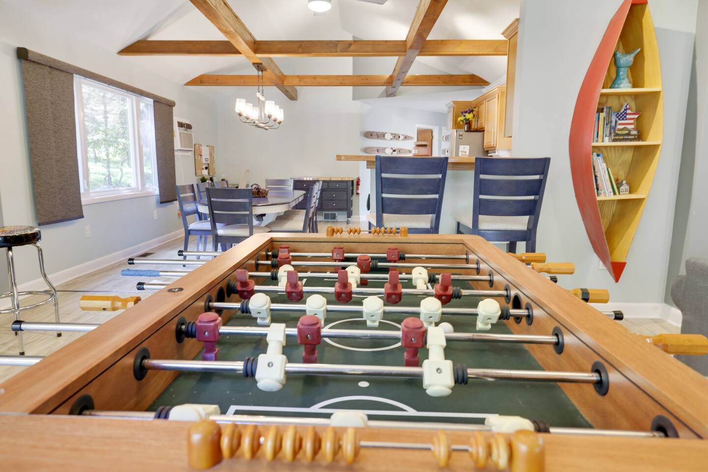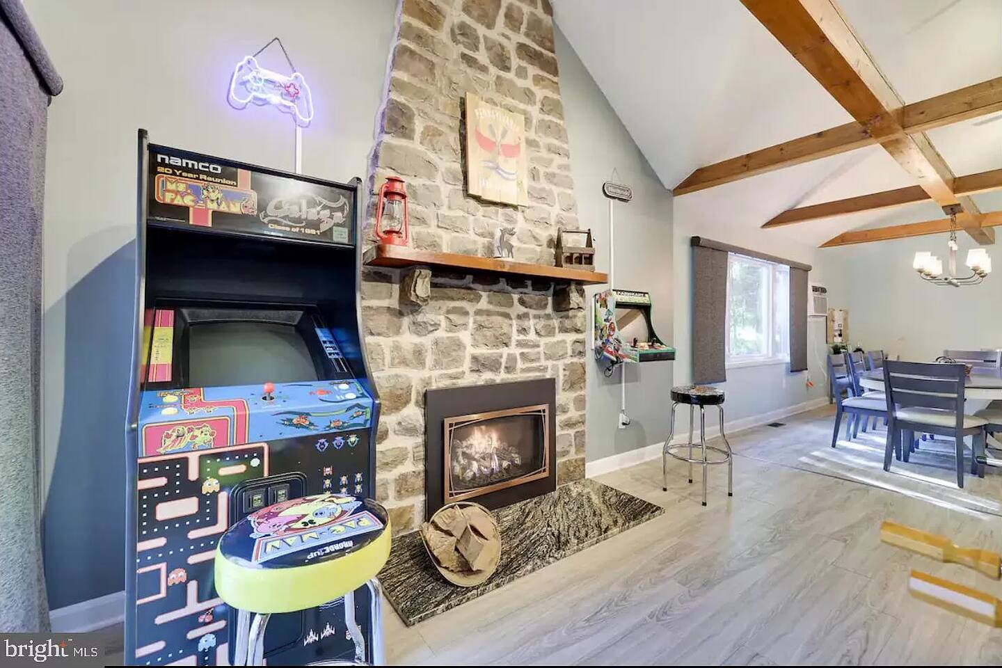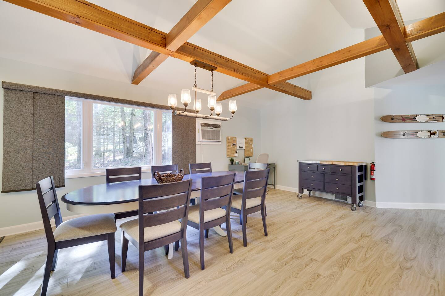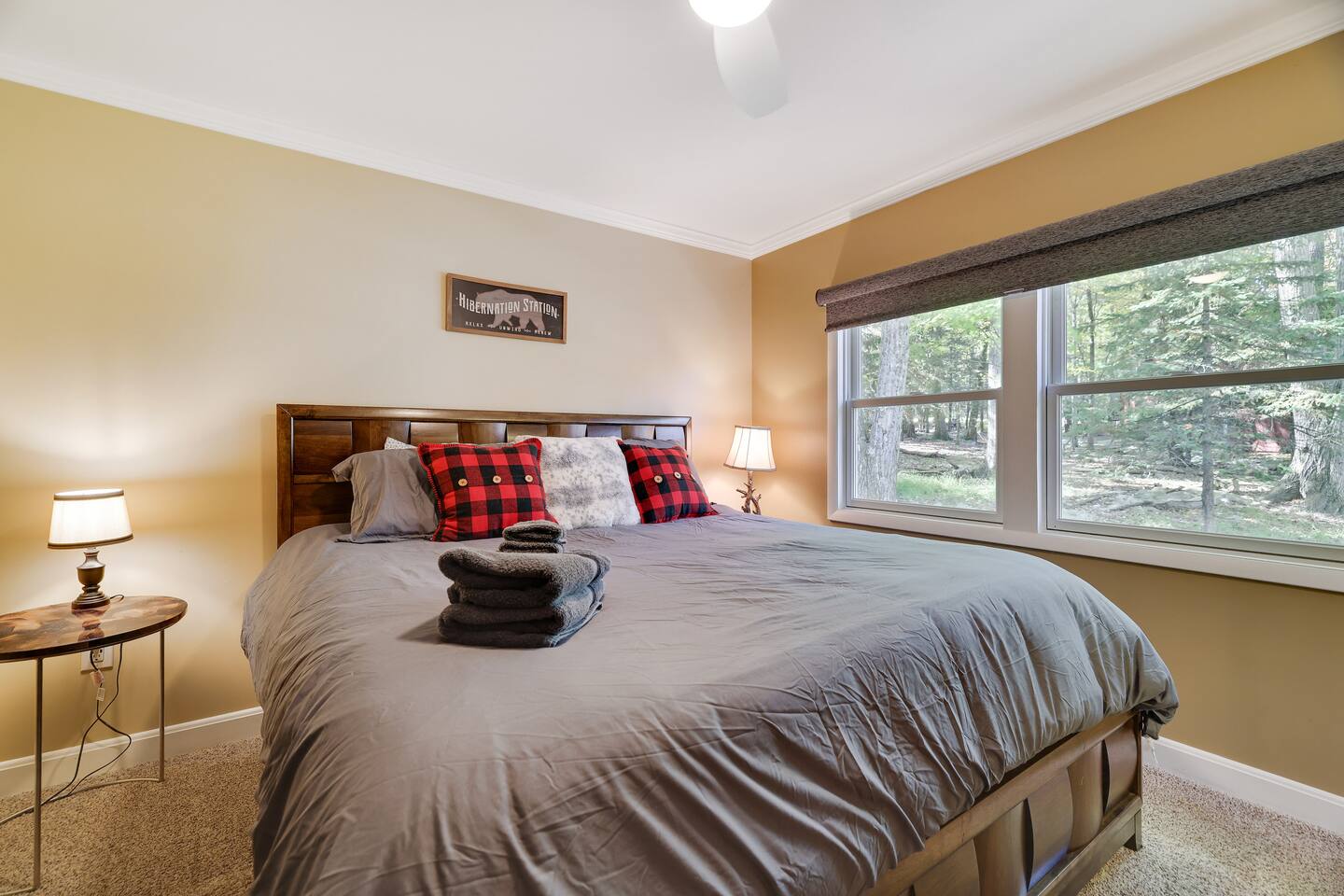 This gorgeous Log Cabin stunner will embrace you the minute you enter the 3-season front porch, telling you that "VACATION HAS STARTED!!" Bearfoot Bungalow is ranked top 5% based on our 54 reviews, you won't be disappointed! Living Space: No one is left out here - - with the fireplace and fun gaming area at one end of the living space and lots of comfy seating with 55" TV at the other end. Bring your vinyl records to play and great ready for a hot cup of coffee by the fireplace or some friendly arcade game competition Galaga & PacMan on one console and a few THOUSAND games from the 80's and 90's on the other! If video games aren't you thing, pick your teams for some Foosball or one of many board games available. Kitchen & Dining Space: The open concept with vaulted ceilings and exposed beams really give you the feeling of the mountains. Our Dining table will easily seat all 8 guests for any meal you decide to cook from the well- appointed kitchen. We have everything necessary to cook a slammin' pancake breakfast or steak dinner... you decide! Bathrooms: We take great pride in presenting a clean, fresh space for you. You will appreciate the beautiful bathrooms with huge glass door showers, multi shower heads (there is a his and hers in the master bath) dimmable mood lighting, even a bidet in the master bathroom! Bedrooms: All Bedrooms have AC! Bedroom 1~We offer a bedroom with a Cherry Wood Bunk that is Full over Full, closet, dresser and smart tv Bedroom 2~ King bed, closet, dresser and smart tv Bedroom 3~ King bed, closet, dresser, smart tv and private bathroom entry ***Linens and Bath Towels are provided for your stay!** Productivity Area: We do not use the ‘W’ word when on vacation! If you cannot break away from certain responsibilities, have no fear! We have a Productivity Station complete with desk, chair, charging station, lamp and 1Gbps connectivity wifi internet. Outside Areas: Be sure to get some fresh air - - bring a cup of coffee out to the 3-seasons room, the attached outdoor porch, or kick back around the SOLO firepit and swap some tales. The deer are abundant and have become accustomed to guests- you are guaranteed a few visitors on the regular :) We are across the street from a huge sporting park which includes a jungle gym for the little ones, soccer, basketball, 2 volleyball courts, baseball and more! (BYO balls) The 5 person Hot Tub off of the main entryway is sure to be a crowd pleaser and is available year round! Entertainment Areas: • Walk to Towne Center for ice cream, bowling, a movie or splash at H2Oooo water park. • Two block walk to the lake where you can set up a picnic or hit the tiki bar for a frozen drink and some lunch! • Split Rock Golf Course is a mile up the street. • The ever-popular Nick's Lake House and Shenanigans are less than 1 mile away for a fabulous meal and great cocktail. The sunsets at Nick's outdoor bar cannot be beat in the summertime! • Walk to Split Rock Lodge on the lake for their outdoor beach bar, Thirsty Moose club, Mexican restaurant & more. • Walk to Yeti Watersports or drive to the opposite end of the lake to Harmony Watersports to rent paddleboards, canoes, sessions for tubing, wakeboarding, and waterskiing. Harmony Watersports will also rent sessions on a pontoon boat so you can fit everyone at once! *We are not able to utilize the Split Rock Pools Guest Requirements: ~Guest must be 25 years of age ~Guest will be required to sign our Short Term Rental Agreement ia our guest portal and send proof of identity via valid drivers license. ~Any sort of smoking must be done outdoors ~Firewood not provided ~Pet Fee $50Per Pet/Per Stay I will send you details about local attractions and shopping once you book. We can't wait to have you! Amy Servis FreeBirdConsulting **PS, if this house isn't available for your desired dates, ask about my other 12+ listings in Lake Harmony!