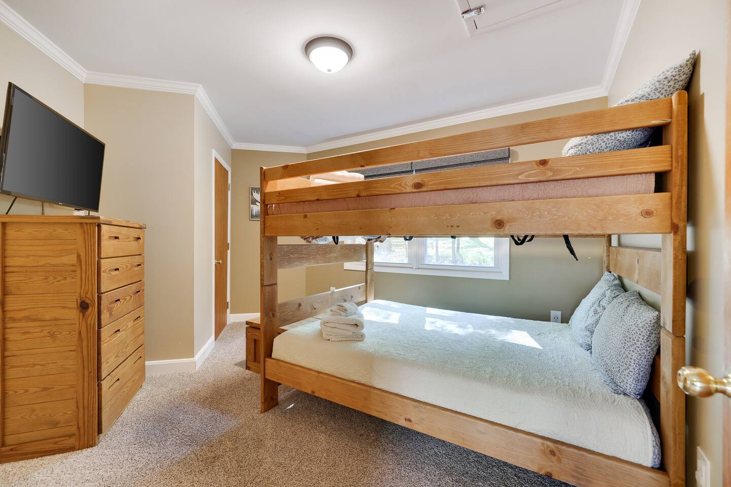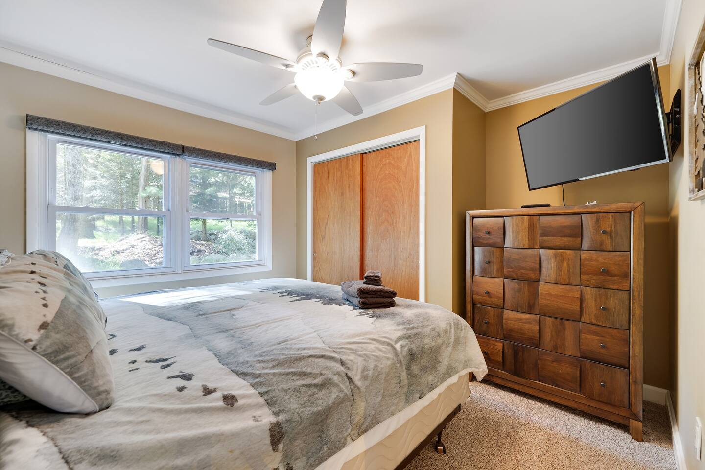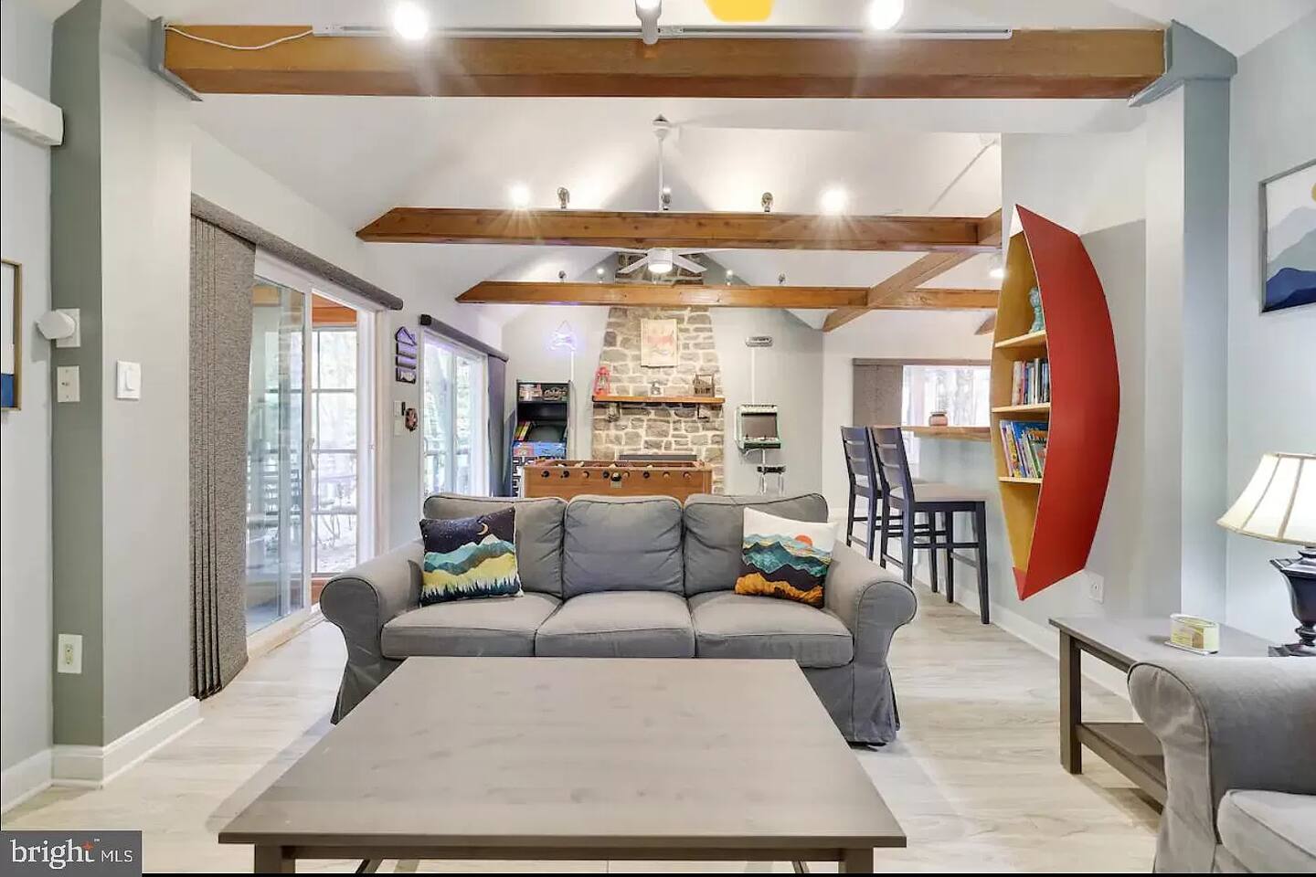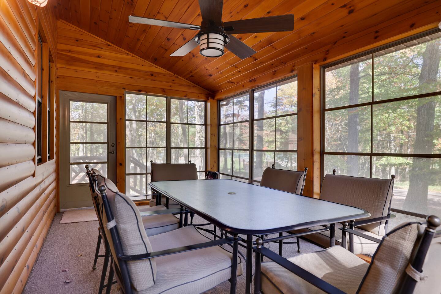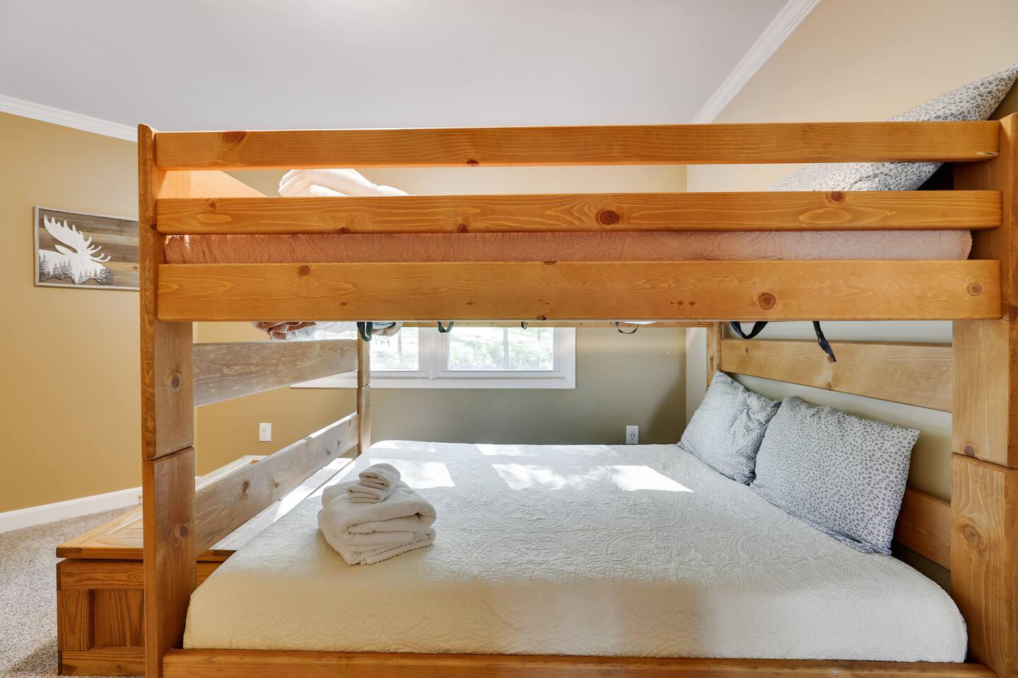 This gorgeous Log Cabin stunner will embrace you the minute you enter the 3-season front porch, telling you that "VACATION HAS STARTED!!" Bearfoot Bungalow is ranked top 5% based on our 54 reviews, you won't be disappointed! Living Space: No one is left out here - - with the fireplace and fun gaming area at one end of the living space and lots of comfy seating with 55" TV at the other end. Bring your vinyl records to play and great ready for a hot cup of coffee by the fireplace or some friendly arcade game competition Galaga & PacMan on one console and a few THOUSAND games from the 80's and 90's on the other! If video games aren't you thing, pick your teams for some Foosball or one of many board games available. Kitchen & Dining Space: The open concept with vaulted ceilings and exposed beams really give you the feeling of the mountains. Our Dining table will easily seat all 8 guests for any meal you decide to cook from the well- appointed kitchen. We have everything necessary to cook a slammin' pancake breakfast or steak dinner... you decide! Bathrooms: We take great pride in presenting a clean, fresh space for you. You will appreciate the beautiful bathrooms with huge glass door showers, multi shower heads (there is a his and hers in the master bath) dimmable mood lighting, even a bidet in the master bathroom! Bedrooms: All Bedrooms have AC! Bedroom 1~We offer a bedroom with a Cherry Wood Bunk that is Full over Full, closet, dresser and smart tv Bedroom 2~ King bed, closet, dresser and smart tv Bedroom 3~ King bed, closet, dresser, smart tv and private bathroom entry ***Linens and Bath Towels are provided for your stay!** Productivity Area: We do not use the ‘W’ word when on vacation! If you cannot break away from certain responsibilities, have no fear! We have a Productivity Station complete with desk, chair, charging station, lamp and 1Gbps connectivity wifi internet. Outside Areas: Be sure to get some fresh air - - bring a cup of coffee out to the 3-seasons room, the attached outdoor porch, or kick back around the SOLO firepit and swap some tales. The deer are abundant and have become accustomed to guests- you are guaranteed a few visitors on the regular :) We are across the street from a huge sporting park which includes a jungle gym for the little ones, soccer, basketball, 2 volleyball courts, baseball and more! (BYO balls) The 5 person Hot Tub off of the main entryway is sure to be a crowd pleaser and is available year round! Entertainment Areas: • Walk to Towne Center for ice cream, bowling, a movie or splash at H2Oooo water park. • Two block walk to the lake where you can set up a picnic or hit the tiki bar for a frozen drink and some lunch! • Split Rock Golf Course is a mile up the street. • The ever-popular Nick's Lake House and Shenanigans are less than 1 mile away for a fabulous meal and great cocktail. The sunsets at Nick's outdoor bar cannot be beat in the summertime! • Walk to Split Rock Lodge on the lake for their outdoor beach bar, Thirsty Moose club, Mexican restaurant & more. • Walk to Yeti Watersports or drive to the opposite end of the lake to Harmony Watersports to rent paddleboards, canoes, sessions for tubing, wakeboarding, and waterskiing. Harmony Watersports will also rent sessions on a pontoon boat so you can fit everyone at once! *We are not able to utilize the Split Rock Pools Guest Requirements: ~Guest must be 25 years of age ~Guest will be required to sign our Short Term Rental Agreement ia our guest portal and send proof of identity via valid drivers license. ~Any sort of smoking must be done outdoors ~Firewood not provided ~Pet Fee $50Per Pet/Per Stay I will send you details about local attractions and shopping once you book. We can't wait to have you! Amy Servis FreeBirdConsulting **PS, if this house isn't available for your desired dates, ask about my other 12+ listings in Lake Harmony!