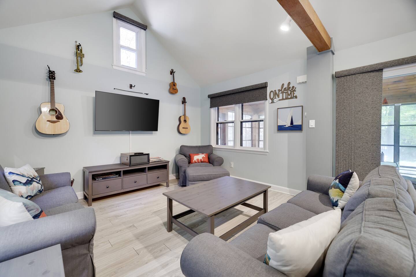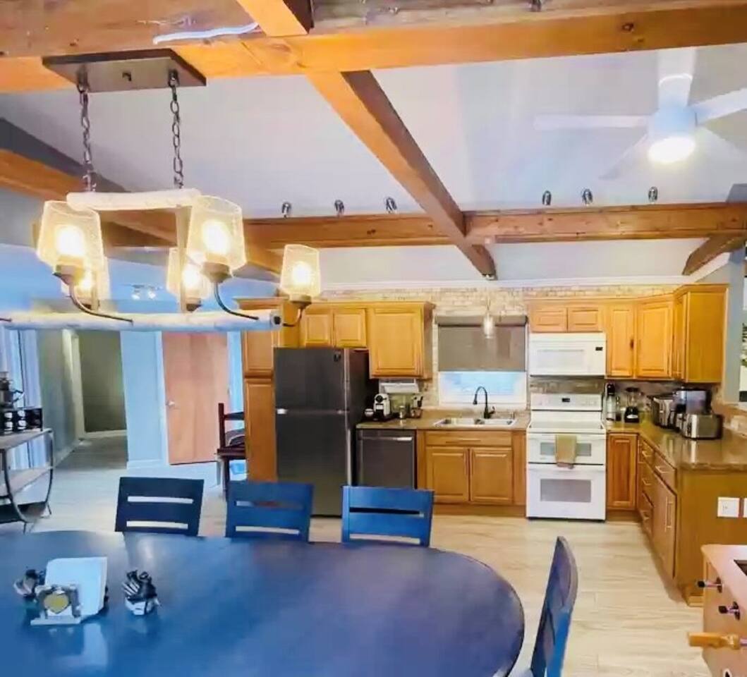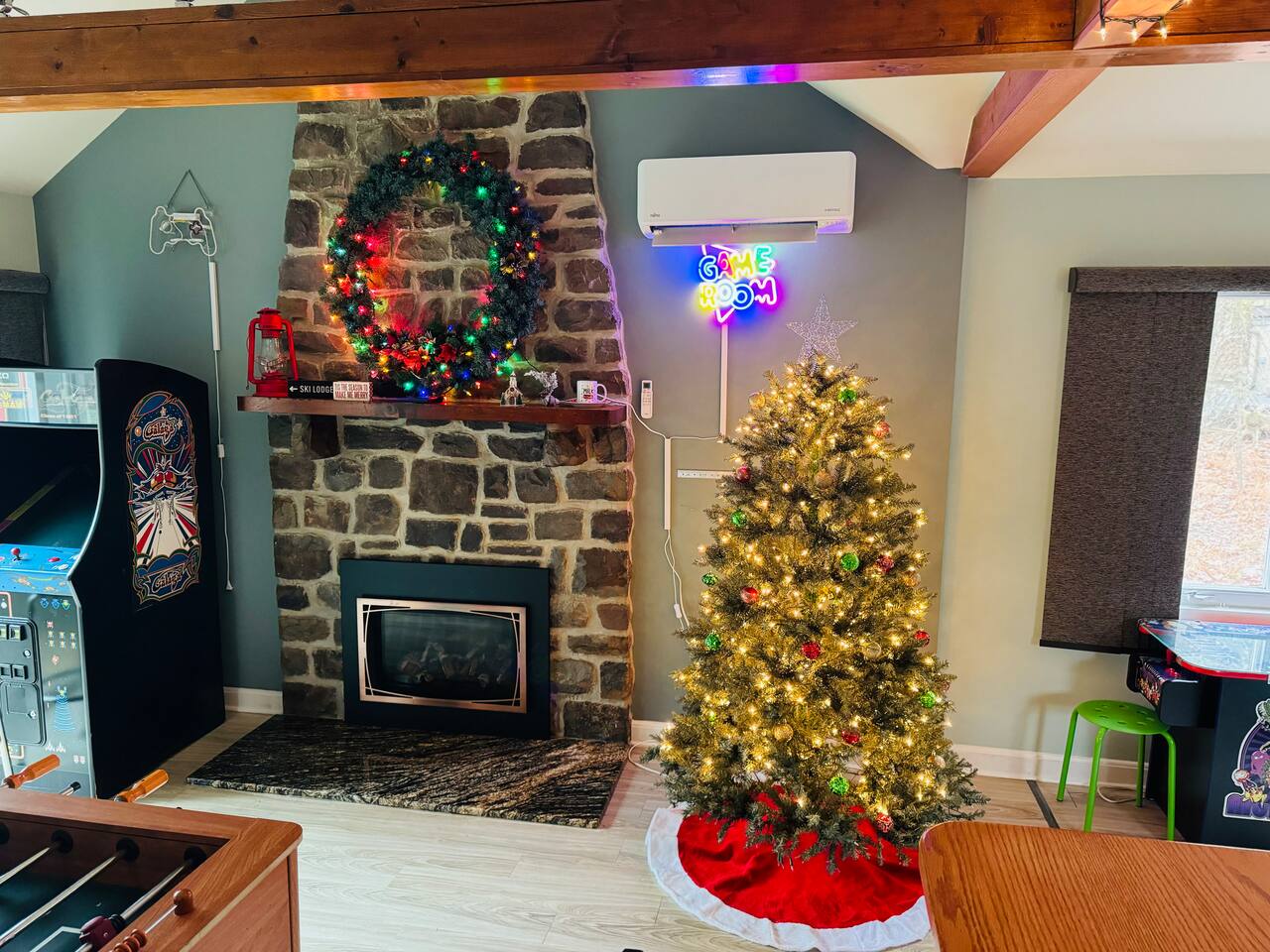 Escape to Bearfoot Bungalow - - our charming, rustic cabin nestled in the heart of the forest offers the perfect balance of seclusion and comfort. With an outdoor hot tub, nearby skiing & arcade games, this getaway is perfect for friends and family! Large beds for your comfort, funky music themed décor, foosball and fun board games! High end amenities, enclosed front porch, plus 2 decks outdoors will give you the relaxation in the woods you are so deserving of