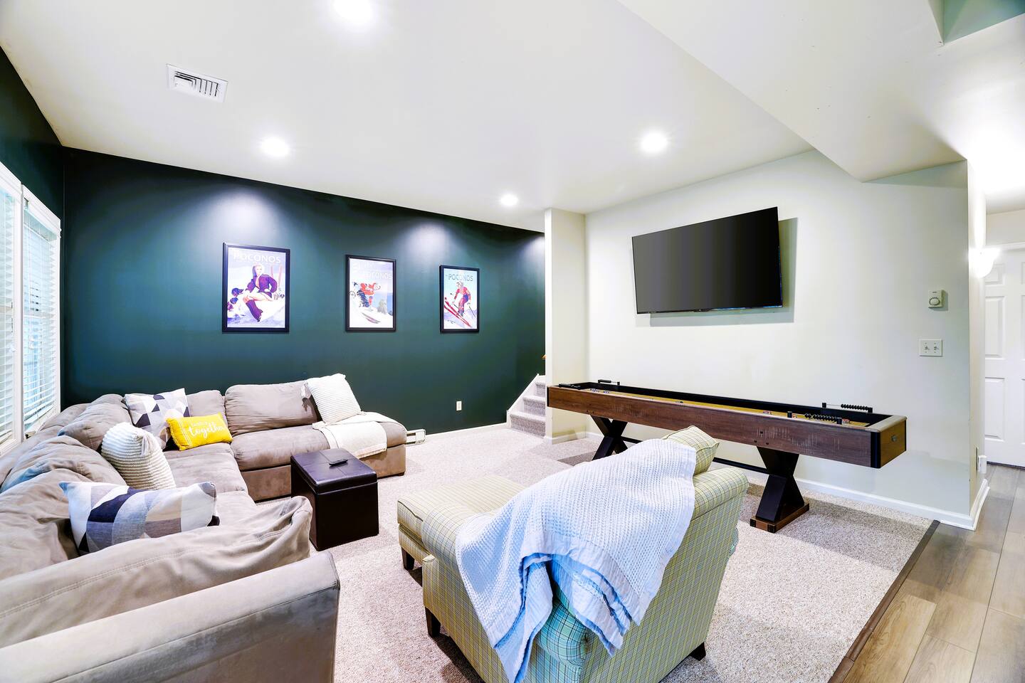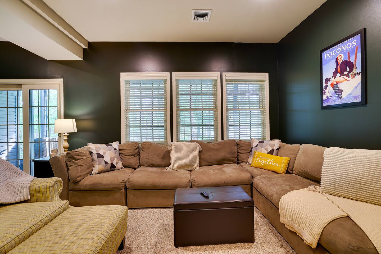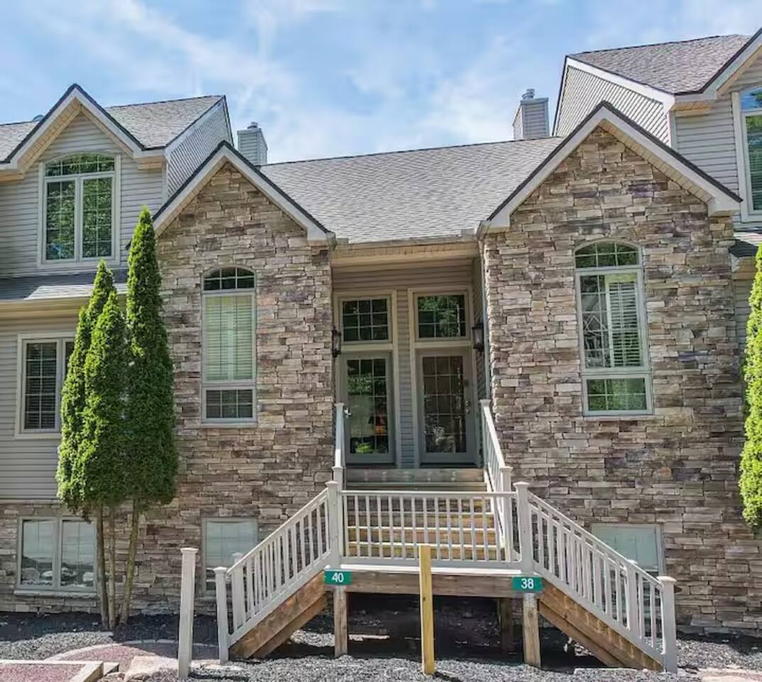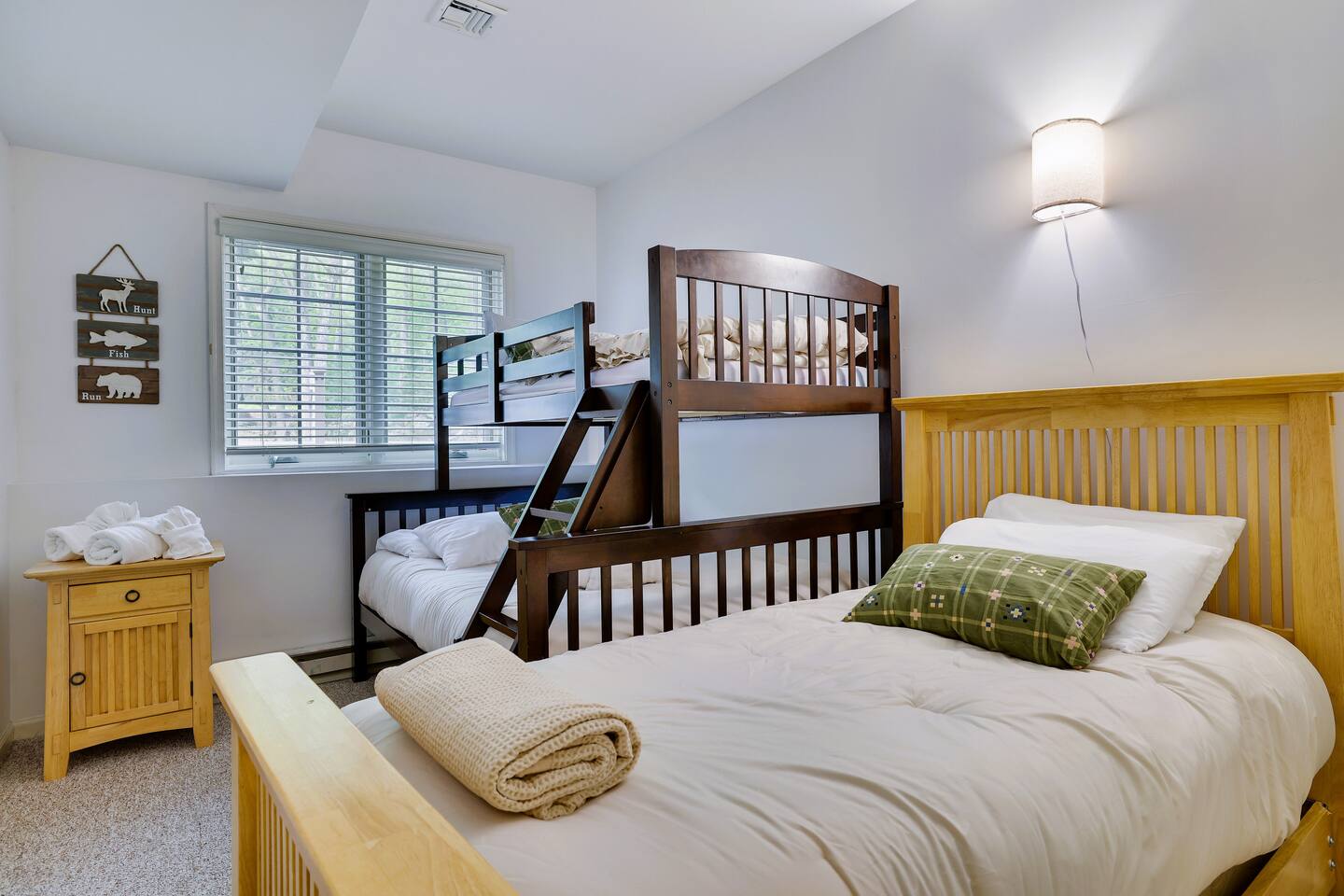 Imagine a home where your family can get away and unwind any time of the year! A quiet community with 175 acre lake and beach on site. A place with less than a half mile drive to ski the black diamonds or hang out in the lodge. Enjoy rounds of golf at the new Jack Frost National 5 star golf course with rolling greens and breath-taking views. It's all waiting for you today! *Please read full description as it will detail some updates being made for your upcoming stay! New bedding, some bed layout changes, more decor and game room updates. Pictures will be updated on or about June 15th :) This is a 5 bedroom 3.5 bath townhome located right at the slopes of Big Boulder Mountain in Lake Harmony PA. In the summer you are minutes from Big Boulder Lake, your stay will INCLUDE LAKE CLUB ACCESS for 12, complete with sandy beach, pool,hot tub, pontoon rentals, basketball, tennis, ping pong picnic area and Boulder View Tavern next door! *all equip/boat rentals are at guest expense* In the winter, you are minutes from the lodge & skiing.. with beautiful mountain views from the back deck With 3 levels, you will never feel cramped! Easy to bring a few families where everyone has their own space! MAIN LEVEL~ Entering the home on the middle floor, you will come up 5 steps to enter the front door, and find the Master bedroom, hallway bath, Kitchen, Dining area and 1st of 2 Living Rooms. The Deck is also off of the dining room on this level, with dining furniture and overlooks the Tennis Courts. The Kitchen is fully stocked with the necessary cookware dishware and utensils for preparing your gang great meals! With an open floorplan, even the designated chef can be a part of the fun! Enjoy the Gas Fireplace in the center of the space while kicking back and watching a movie UPPER LEVEL~ 2 bedrooms, Loft sleeping and full bath LOWER LEVEL~2 bedrooms, 1 full bath, 2nd Living Room with gaming area and laundry. Access outside thru sliders will take you to a covered seating area looking out to the Tennis/Pickleball court. The Game Room has a Shuffleboard Table (new addition), AirHockey Table and Foosball Table. Lots of board games provide as well for fun family time! BEDROOM SETUPS: 1. Master is on main floor, upgrading to a King bed in May (as listed). Smart TV, Room Darkening blinds, bureau and large closet. The En-Suite bathroom includes a corner soaking tub, walk in shower and lit vanity. 2. Upstairs 1 has Two Twin Beds, Bureau Closet and TV 3. Upstairs 2 has a Queen bed, bureau, Closet and TV 4. Lower Level 1 has a Twin over Full bunk, PLUS another Full Bed. Closet and room darkening blinds 5. Lower Level 2 will upgrade to a Queen over Queen Trundle bed, room darkening blinds and large closet 6. Upper level loft has a futon for added sleeping option Other things to note There is assigned parking out front for 2 cars - with passes for 2 additional cars in the overflow parking (first come basis). We ARE Pet friendly- **we ask that you bring furniture covering if they are permitted on beds/furniture at home We do NOT provide beach towels, please bring from home Being in the Big Boulder Community, we have access to the all year round in door Split Rock Water Park. No need to stay at the hotel to gain access but there is a fee to enter. Please be aware we have our own Stay Agreement that you will need to approve once booked to ensure you abide by our terms and conditions and registration with our HOA Please Note: Weekly reservations preferred :)