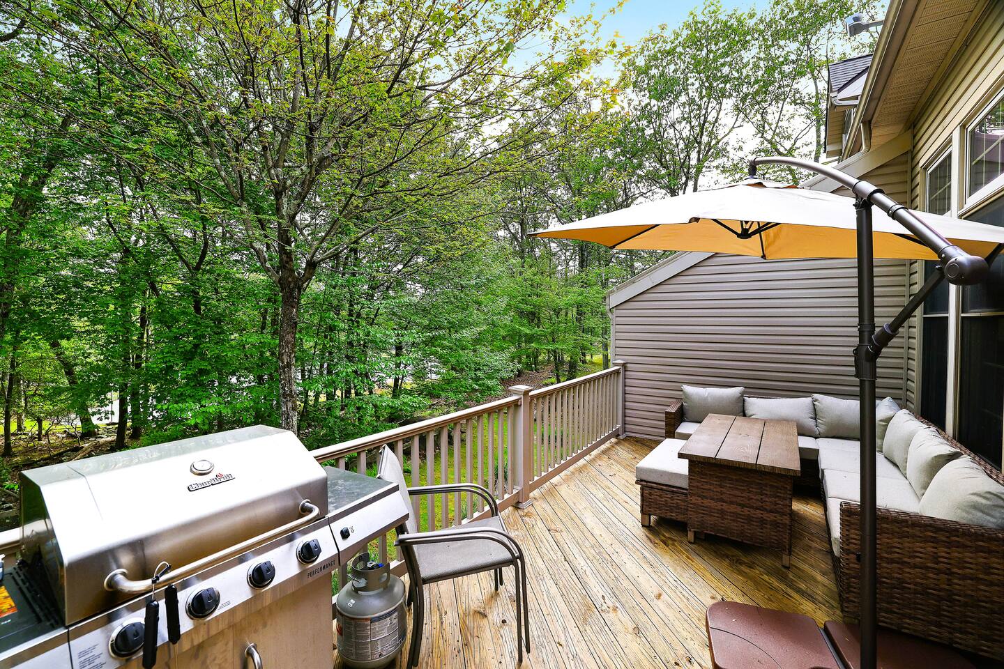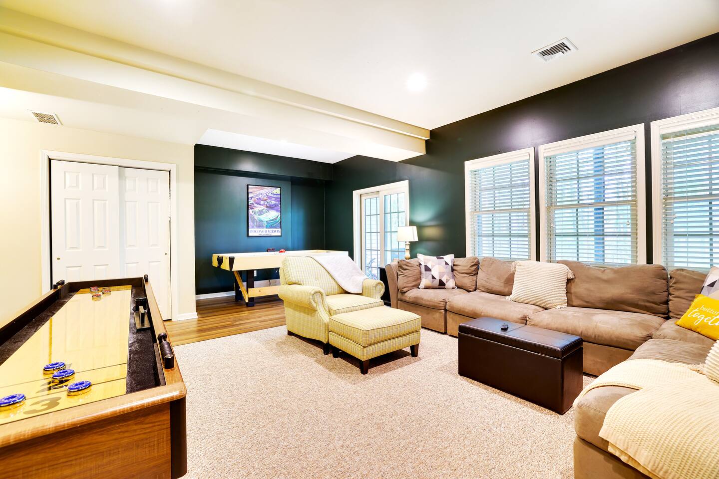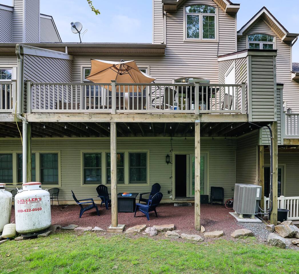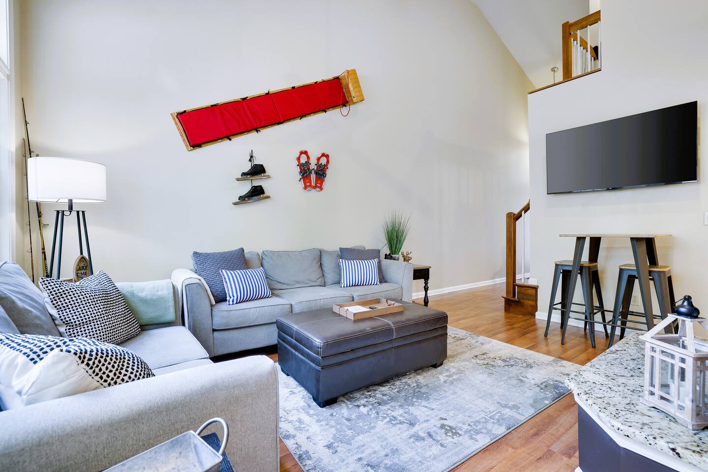 Imagine a home where your family can get away and unwind any time of the year! A quiet community with 175 acre lake and beach on site. A place with less than a half mile drive to ski the black diamonds or hang out in the lodge. Enjoy rounds of golf at the new Jack Frost National 5 star golf course with rolling greens and breath-taking views. It's all waiting for you today! *Please read full description as it will detail some updates being made for your upcoming stay! New bedding, some bed layout changes, more decor and game room updates. Pictures will be updated on or about June 15th :) This is a 5 bedroom 3.5 bath townhome located right at the slopes of Big Boulder Mountain in Lake Harmony PA. In the summer you are minutes from Big Boulder Lake, your stay will INCLUDE LAKE CLUB ACCESS for 12, complete with sandy beach, pool,hot tub, pontoon rentals, basketball, tennis, ping pong picnic area and Boulder View Tavern next door! *all equip/boat rentals are at guest expense* In the winter, you are minutes from the lodge & skiing.. with beautiful mountain views from the back deck With 3 levels, you will never feel cramped! Easy to bring a few families where everyone has their own space! MAIN LEVEL~ Entering the home on the middle floor, you will come up 5 steps to enter the front door, and find the Master bedroom, hallway bath, Kitchen, Dining area and 1st of 2 Living Rooms. The Deck is also off of the dining room on this level, with dining furniture and overlooks the Tennis Courts. The Kitchen is fully stocked with the necessary cookware dishware and utensils for preparing your gang great meals! With an open floorplan, even the designated chef can be a part of the fun! Enjoy the Gas Fireplace in the center of the space while kicking back and watching a movie UPPER LEVEL~ 2 bedrooms, Loft sleeping and full bath LOWER LEVEL~2 bedrooms, 1 full bath, 2nd Living Room with gaming area and laundry. Access outside thru sliders will take you to a covered seating area looking out to the Tennis/Pickleball court. The Game Room has a Shuffleboard Table (new addition), AirHockey Table and Foosball Table. Lots of board games provide as well for fun family time! BEDROOM SETUPS: 1. Master is on main floor, upgrading to a King bed in May (as listed). Smart TV, Room Darkening blinds, bureau and large closet. The En-Suite bathroom includes a corner soaking tub, walk in shower and lit vanity. 2. Upstairs 1 has Two Twin Beds, Bureau Closet and TV 3. Upstairs 2 has a Queen bed, bureau, Closet and TV 4. Lower Level 1 has a Twin over Full bunk, PLUS another Full Bed. Closet and room darkening blinds 5. Lower Level 2 will upgrade to a Queen over Queen Trundle bed, room darkening blinds and large closet 6. Upper level loft has a futon for added sleeping option Other things to note There is assigned parking out front for 2 cars - with passes for 2 additional cars in the overflow parking (first come basis). We ARE Pet friendly- **we ask that you bring furniture covering if they are permitted on beds/furniture at home We do NOT provide beach towels, please bring from home Being in the Big Boulder Community, we have access to the all year round in door Split Rock Water Park. No need to stay at the hotel to gain access but there is a fee to enter. Please be aware we have our own Stay Agreement that you will need to approve once booked to ensure you abide by our terms and conditions and registration with our HOA Please Note: Weekly reservations preferred :)