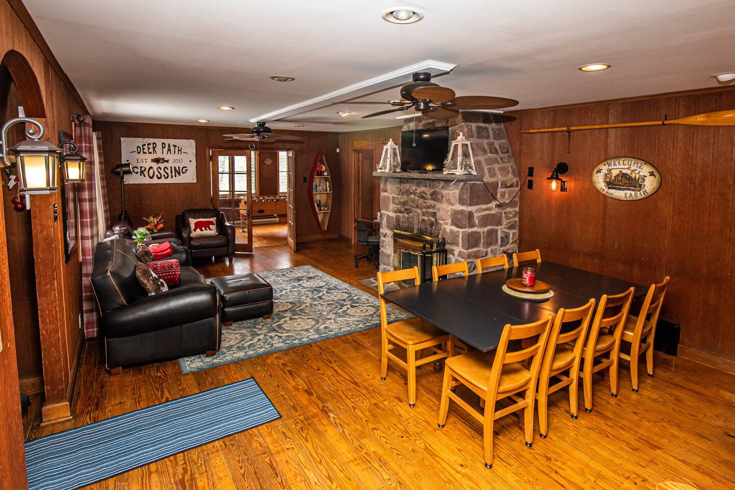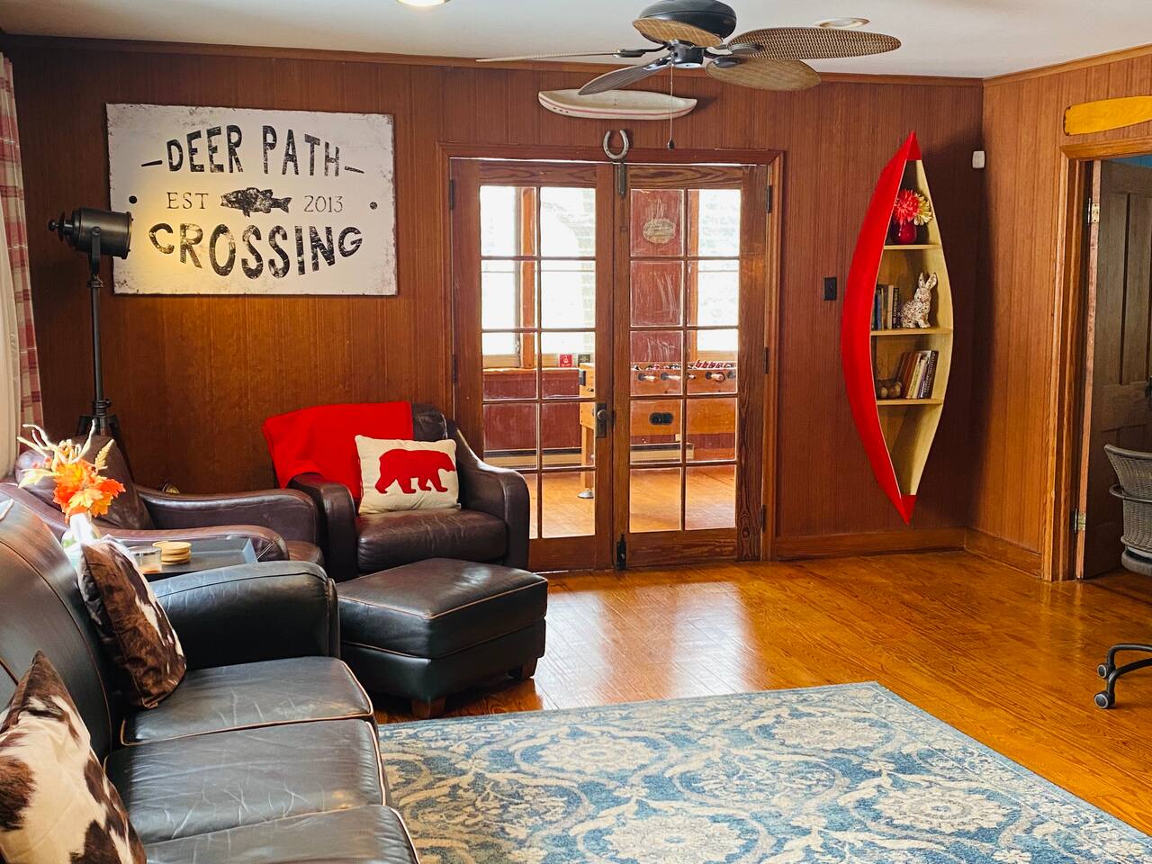 Walking into DeerPathCrossing is like walking into VACATION! We are on the more relaxes side of the lake, NorthLakeDrive,and walking distance to all restaurants on the south end such as Piggy's, Nick's Lakehouse & Shenanigan's Summer time lake fun can't be beat! I'll send you lake access options once booked, there's plenty of fun to be had with paddleboard, kayak, waterski, tubing and pontoon rentals! All details provided in my welcome guide once booked :) Enter into the main living space with stone wood burning fireplace, true gentlemen leather seating area and wood work at it finest. The front enclosed porch houses the bar, Harvard foosball table, darts and large table for games and socializing. Louvred glass windows will give you the best breeze in the warm months, with newly installed Heat/AC in this room to keep you as comfortable as possible! Serve your favorite wine out of the wine bar station in the kitchen, complete with wine refrigerator, and electric bottle opener. If you prefer a great cup of Joe, you have your choice of French Press or make a hot or cold specialty coffee on the Ninja set. After a day hiking or on the slopes, hit the Hot Tub!! Dry your boots/shoes in our AlpenHeat warmer/dryer, jump in the shower and enjoy the towel warmer as you get refreshed for your evening plans. Summer rentals will have Central Air to keep you as comfy as can be. With a large yard, picnic table for 10 outdoor private hot tub and even a climbing station for the kids, you can enjoy summer to the fullest! BATHROOMS: Full Bathroom on main floor with walk in glass shower and separate soaking tub Full bathroom upstairs, Water Closet room and private Shower room with walk in glass shower Smart TV in the family room and upstairs queen room HUGE propane grill on deck off of the kitchen Kitchen is fully stocked with cookware and dishware for your crew The cabin is located moments from Nick's Lakehouse, Shenanigans and other lakeside eateries. In the WINTERTIME, we are just 1.2 miles to Big Boulder Ski Resort, and 5 miles to Jack Frost Ski Resort. 2 miles to Split Rock Golf links, and 5 miles to Jack Frost Golf, or stretch your legs at Hickory Run State Park or take a short drive into Jim Thorpe for the day. Once you book, I will send you a local attraction document to help plan your best trip ever! We look forward to hosting you! If your desired dates are unavailable, please ask about my 12 other homes, all in Lake Harmony! Guest Requirements: Guest must provide email, drivers license copy and sign rental agreement sent once booked via our guest portal. Guest must be 25yrs of age or older to book. Pet fee is $50 per pet/per stay Keep any smoking outdoors, left Butts will incur fee Abide by area noise ordinance detailed in rental agreement. Follow Checkout procedure. Firewood not included. Park only on designated driveway area. ~Pack n Play & HighChair onsite at all times Look forward to hosting you! Amy Servis, FreeBirdConsulting, LLC