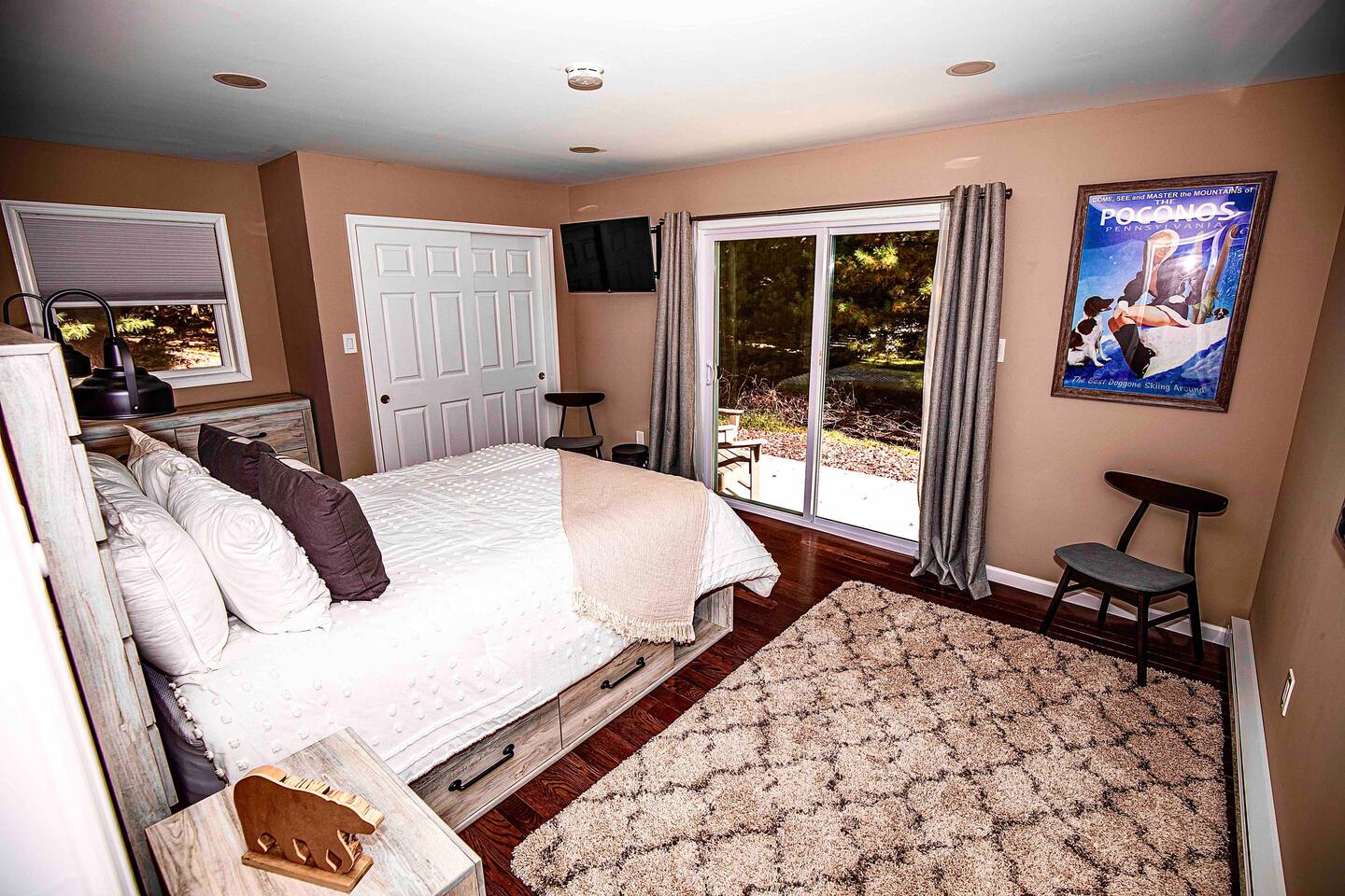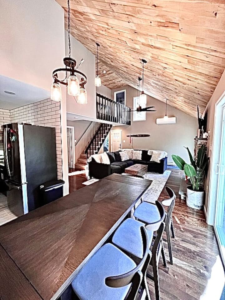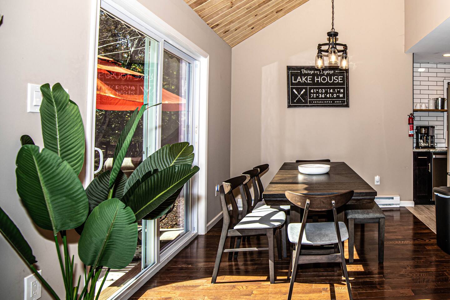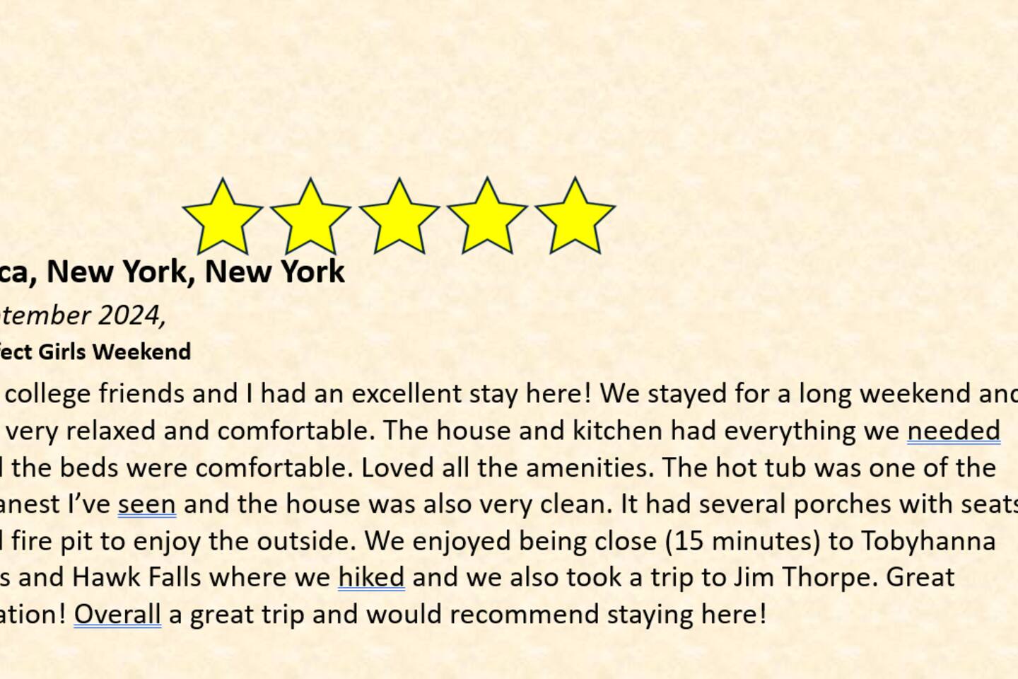 Freshly modern yet fun pocono home in The Estates of Lake Harmony. There's plenty of room for your whole crew! We offer beach access to the Estates Beach in the summer time (Memorial Day thru Labor Day), Tennis and Pickleball court, close proximity to Split Rock and Jack Frost Golf Courses, and soooo much outdoor activity! In the Wintertime you will be just 1.5 miles to Big Boulder or 4 miles to Jack Frost slopes and Tubing! Divine on Lupine is newly furnished, please come and enjoy the thought and effort put into this home. The large dining area provides ample room for everyone to gather around and there is a big sectional sofa for game day or movie night. Outside you can sit out front under the multiple awnings or go to the back yard for smores at the firepit or a soak in the 7 person hot tub! There's no shortage of space and comfort here! Let your VACATION BEGIN! Let's run down the house: Living & Fun Spaces: *All rooms have air conditioning and heating splits* Open concept living area with vaulted tongue and groove ceilings will make you feel welcome the second you enter. Features a first floor living room with Remote Control Gas Fireplace, 55" Smart TV, Large Sectional Sofa and dining for 10. Off of the living area is a separate game room where you will find another smart TV, Arcade table with 60 games for two people, Beer Fridge, oversized Connect4 and futon for the loudest sleeper :) The Game room has glass sliding doors leading out to the Hot Tub patio. Super convenient! Kitchen and Dining: The Kitchen is fully stocked with anything and everything the Chief cook and bottle washer might need to supply the troops! Large cooking pans/pots/utensils and the like are here for you, as well as gas BBQ for out door options. Of course the all important cocktail glasses and coffee maker are at the ready. We have a 12cup drip with frother and option to make single serve or Iced Bedrooms: All Bedrooms have individual heat and AC splits, and room darkening shades. Linens and towels are included, bring your own beach/hot tub towel and toiletries **Bedroom 1~Main floor bedroom is spacious! Queen bed, dresser and full closet with sliders to the side porch. Smart TV and Room darkening curtains/shades included. **Bedroom 2~ Upstairs Queen bed, En-Suite to half bath, with closet, dresser, smart tv and room darkening shades. **Bedroom 3~Upstairs Full Bed with Twin over Full Bed. En-Suite to full bathroom, closet, dresser, smart tv room darkening shades. **The futon is in the downstairs game room. I didn't list it as a 4th bedroom since its used for other shared purposes. Bathrooms: We take great pride in presenting a clean, fresh space for you. You will appreciate the beautiful bathrooms, each having modern fixtures and beautiful wood accents. Full bathroom downstairs, with the 2nd full bath upstairs in the room with Queen bed and half bath in the upstairs room with 3 beds. Productivity Area: We do not use the ‘W’ word when on vacation! If you must bring a little work with you, our 3 person hightop can easily accommodate your laptop! Highspeed WiFi will keep you connected until you can close up shop and get back to the fun! Outside Areas: Breath in the fresh clean air while here! Take your coffee out front to the dining bistro set, read a book under the awning on the side patio or go around back to the circular firepit and have a few beers. The large hottub is around back with separate patio off of the game room. (3 patios in total) Children: Cribs, pack and play, high chairs and bed rails are all available to rent upon request Local Highlights : • The ever-popular Nick's Lake House and Shenanigans are less than 1 mile away for a fabulous meal and great cocktail. The sunsets at Nick's outdoor bar cannot be beat in the summertime! • Walk to Split Rock Lodge on the lake for their outdoor beach bar, Thirsty Moose restaurant and more. • Schedule your tee time at Split Rock Golf Course, just a mile away • Reserve time on the lake via LakeHarmony Watersports or Captain Wolf...rent paddleboards, canoes, sessions for tubing, wakeboarding, and waterskiing. Harmony will also rent sessions on a pontoon boat so you can fit everyone at once! *Bring your tennis or Pickleball racquets and hit our community court MORE THAN A LAKE & SKI DESTINATION In addition to the lake and skiing, we are very close to ATV tours, restaurants, bars, h2ooooh waterpark, golf course and slopes. Literally less than 5 minutes. And Kalahari Indoor Water Park is about 20 mins away. Hiking, mountain biking, paintball, NASCAR racetrack, Jim Thorpe, horseback riding, whitewater river rafting, pumpkin & Apple picking. You name it, it’s all within 5-20 minutes from us! Things to note- Guest agrees to approve our stay agreement sent via guest portal once booked Guest agrees to provide proof of ID via drivers license & must meet age requirement of 24+ No smoking indoors, left buts will cost $10per Pet fee $50 PerPet/PerStay I will send you details about local attractions and shopping once you book. We can't wait to have you! Amy Servis FreeBirdConsulting **PS, if this house isn't available, please ask me for availability at one of my other 12 homes in Lake Harmony! 2 bedroom-5bedroom
