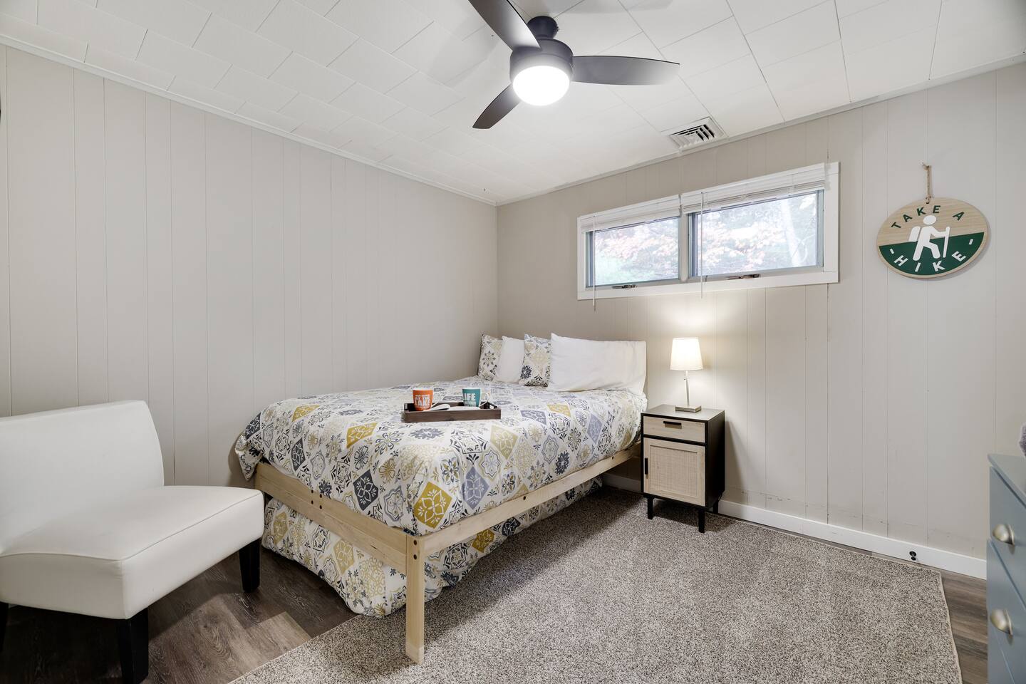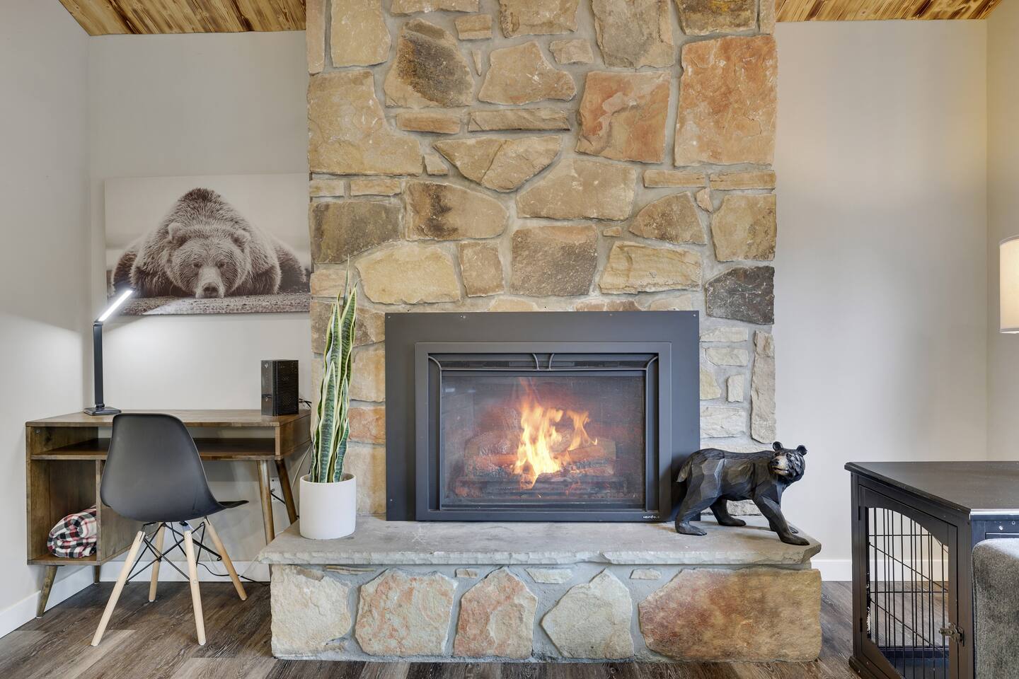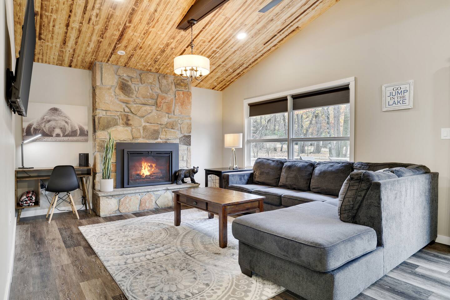 A cozy mountain chalet offering quality pleasures both inside & out. Comes with LAKE and BEACH access free in summertime, close to Ski and Golf too! • Inside you'll find an open layout seamlessly flowing from room to room w propane stone fireplace & gourmet kitchen. • 2 bedrooms w/ trundle beds & SmartTV's. • Outdoor 6 person Hot Tub, Deck propane & Firepit. Modern Elegance and Amenities merged with Rustic Charm, Tranquility & Nature is where you'll make Harmonious Mountain Memories.