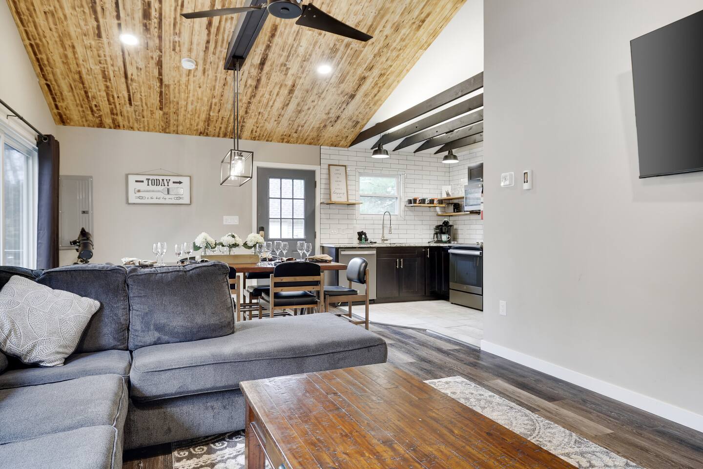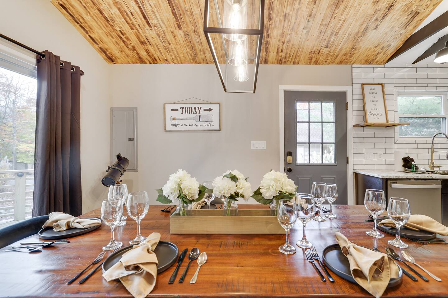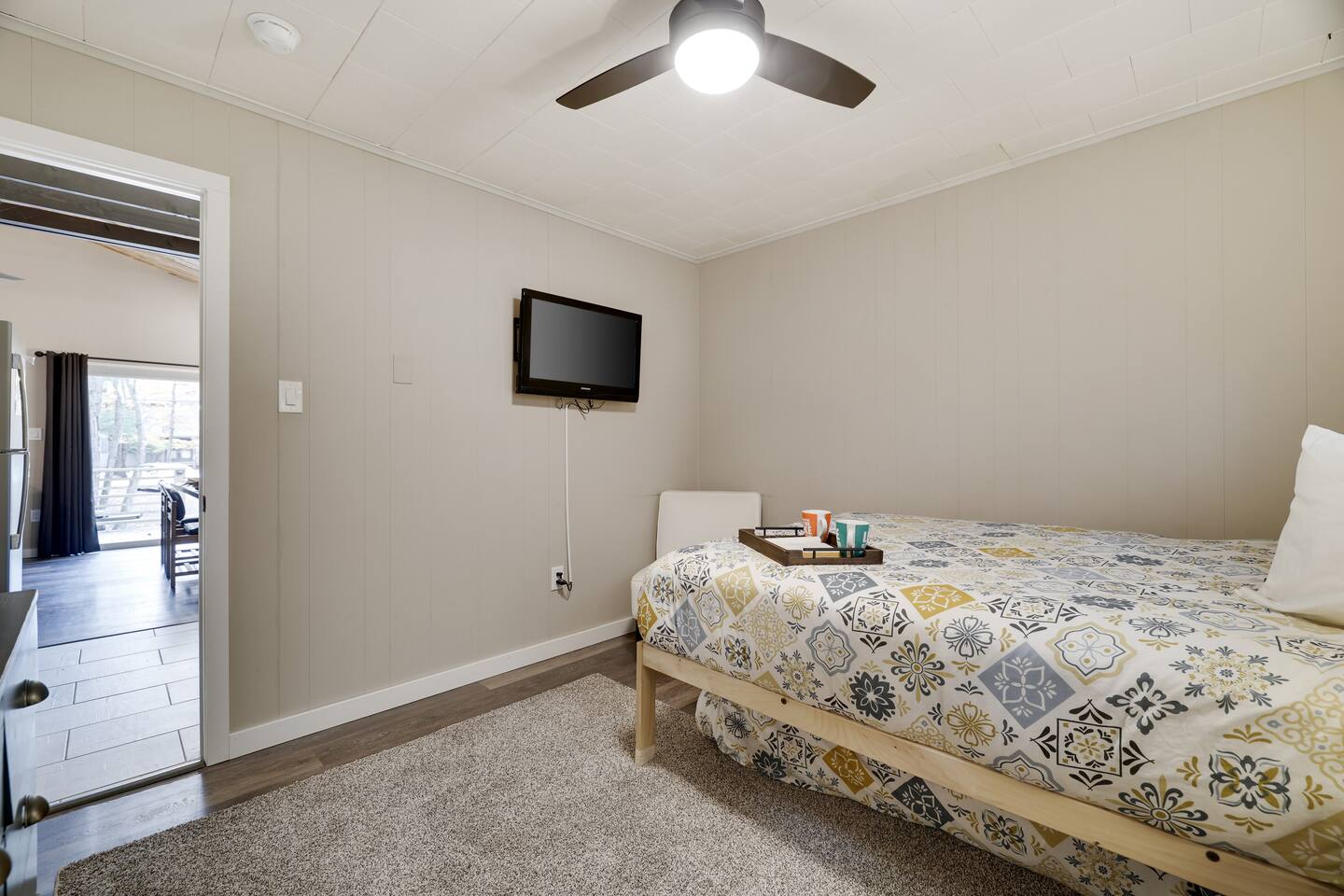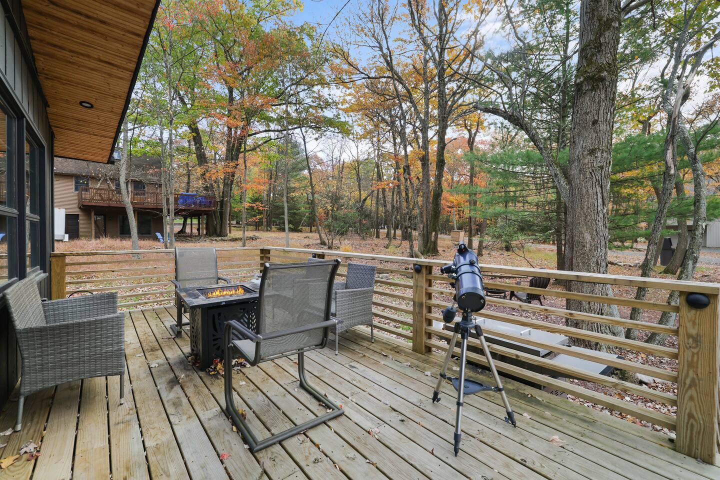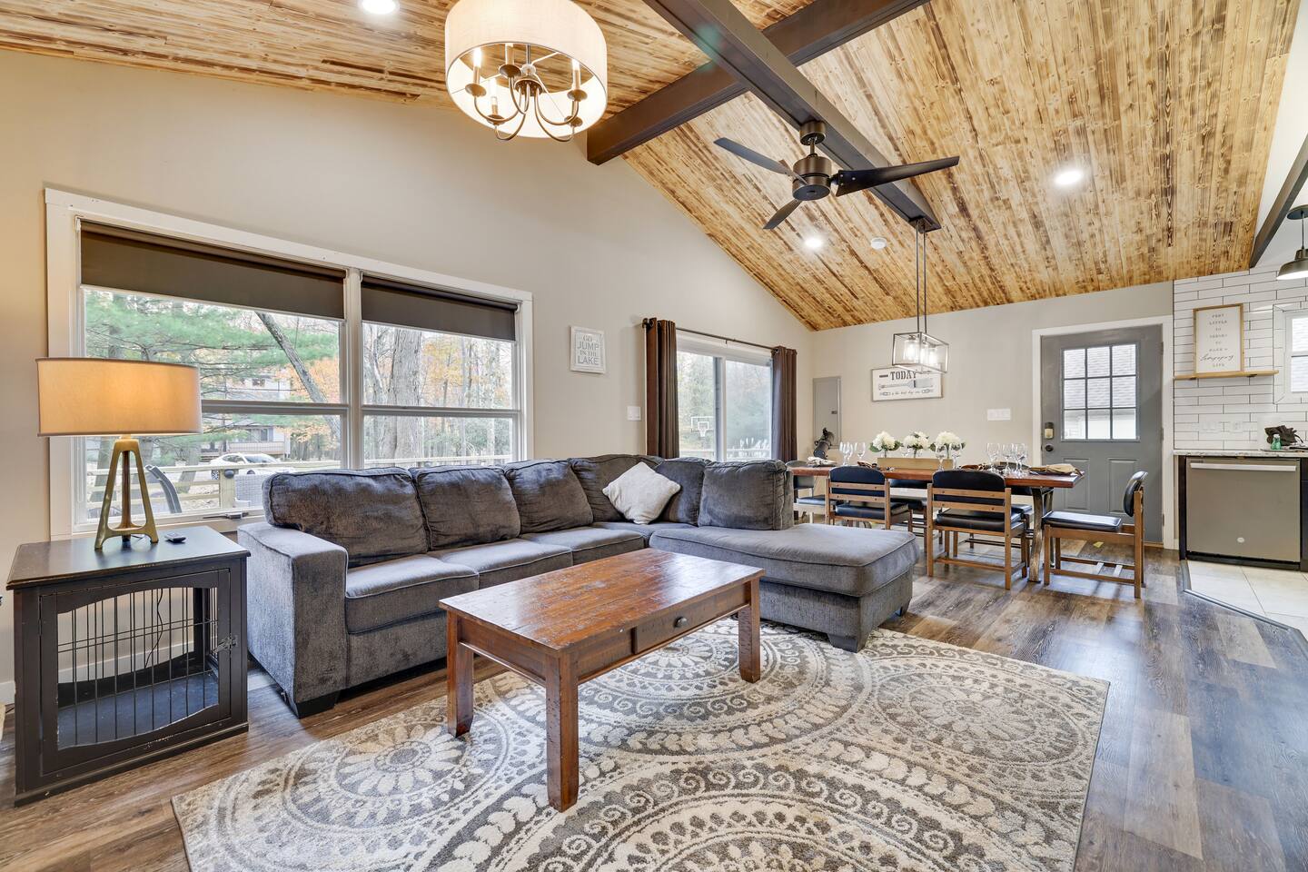 WELCOME TO VACATION! Inside you'll find an open layout seamlessly flowing from room to room w propane stone fireplace & gourmet kitchen. • 2 bedrooms w/ trundle beds & SmartTV's. • Outdoor 6 person Hot Tub, Deck propane & Firepit. Modern Elegance and Amenities merged with Rustic Charm, Tranquility & Nature is where you'll make Harmonious Mountain Memories.→ Vaulted ceilings overtop an open and flowing layout seamlessly combining a spacious living room, dining area and gourmet kitchen. → Living room boasts propane stone fireplace, wrap around sectional sofa and 60" high def TV with streaming service. → Expansive farm style table for group meals or games. → Gourmet kitchen beaming with granite tops, Stainless Steel appliances, elegant tile backsplash and chic floating shelves. → 2 bedrooms both with Queen Size trundle beds, each room equipped with Roku connected wall mounted flat screen TV's & remote operated ceiling fans/lights. → Spa style bathroom boasts a stall shower with bench seat, river rock floors and waterfall shower. Be sure to check out the wifi bathroom audio and illuminated & heated commode seat! → Washer/Dryer provided for your convenience. → Outside features a private rear 6 person Hot Tub for your enjoyment as well as an expanded deck with propane fireplace. → Firepit off the deck for traditional campfires, s'mores, hotdogs & deer watching! → Lake Access comes with your rental! This cabin is located within Lake Harmony Estates, which means you have passes to their private beach area! An easy walk to the lake will bring you to the beach which has sand of course, volleyball and a water float for everyone's fun. → Activities are abundant in the Poconos! Harmony Hideaway is walking distance to Split Rock Resort including their outside beach bar, and moments from Nick's Lakehouse, Shenanigans, Piggy's breakfast spot and the amazing Hog's Heaven Ice Cream and more. Hickory Run State Park hosts Boulder Field, miles of hiking and waterfalls, beaches and more. Take a quick drive and stroll through Jim Thorpe for the day, or visit H2Oooo water park which is just steps away at the Split Rock Towne Center Wintertime fun is a quick 2 miles to Big Boulder, 4 miles to Jack Frost, and 20 minutes to Camelback.. Guest Requirements: provide email to receive and approve Short Term Rental Agreement. Copy of drivers license upon request Guest must be 25yrs of age or older to book. Pet fee is $40 per pet/per stay We hope to see you in Lake Harmony soon! If you have any questions about the home or the area, please ask away! Amy Servis, Free Bird Consulting ps, if your desired dates are unavailable, please ask if I have availability with one of the 12 others in Lake Harmony!