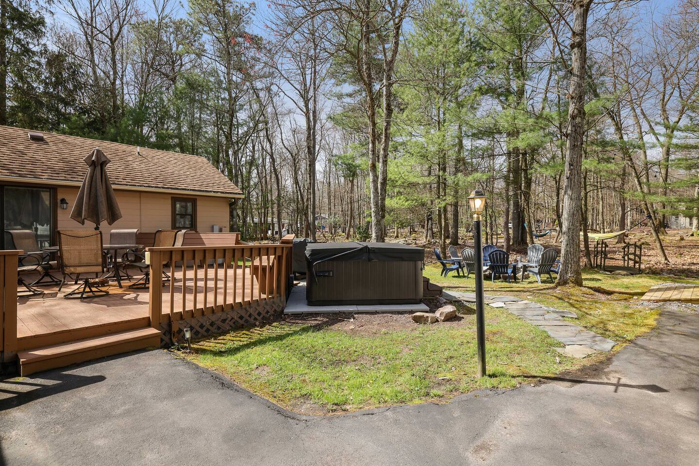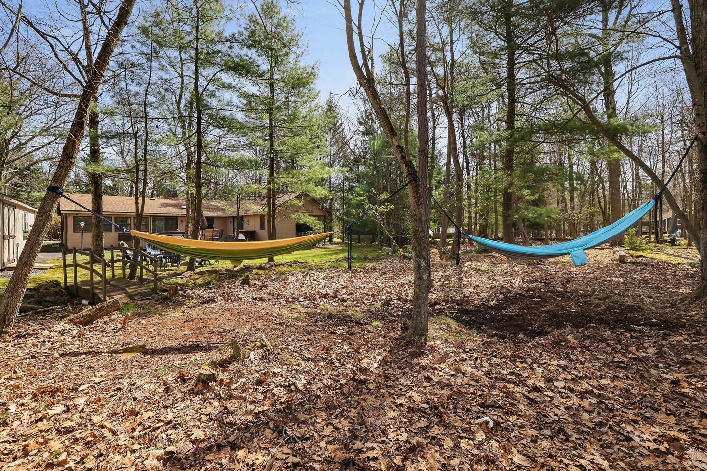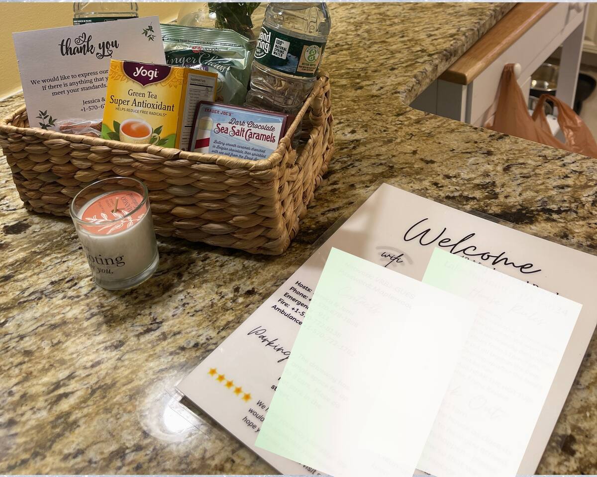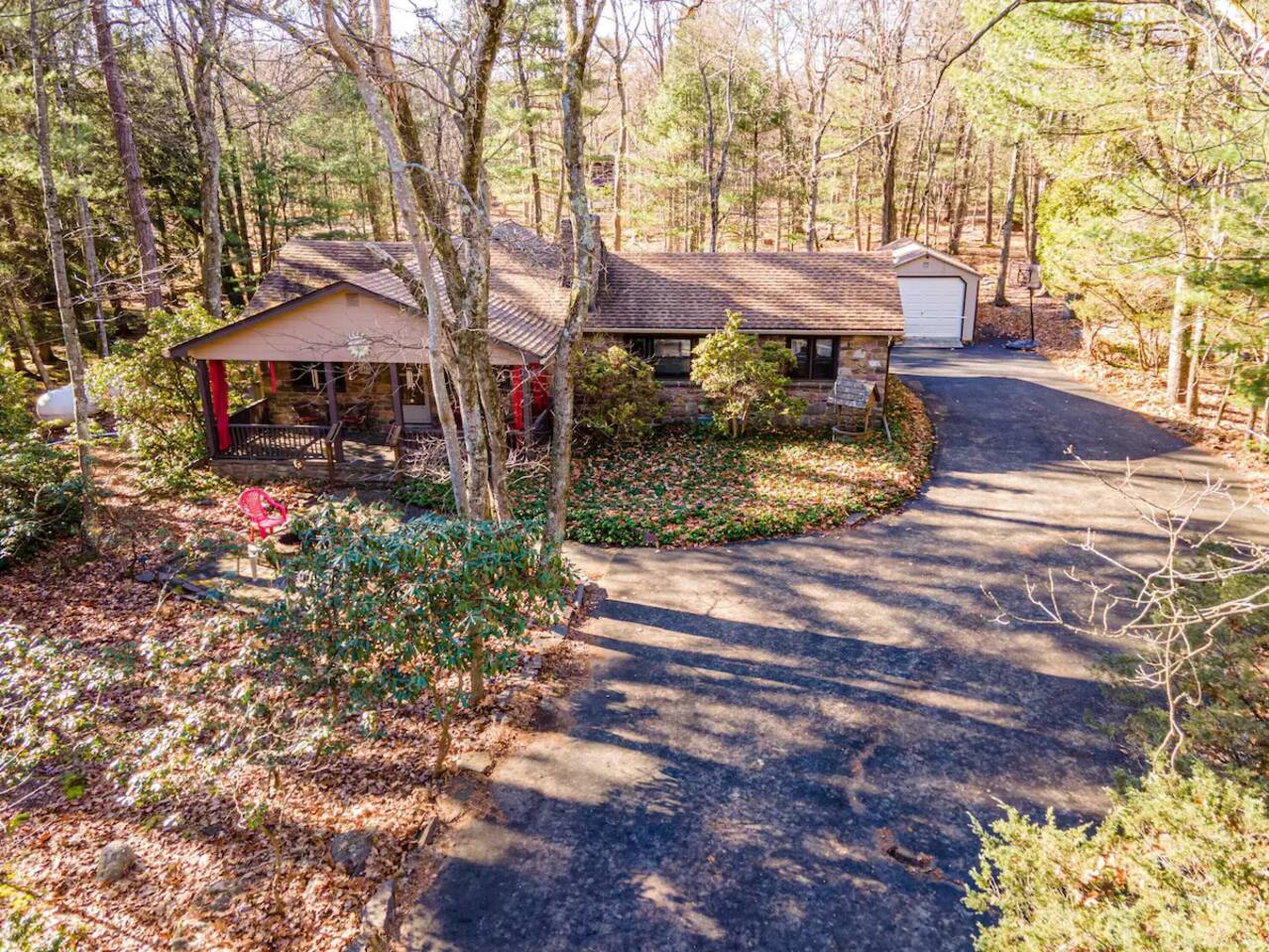 Why Youβll Love It! π Spacious Layout -Sleeps 11 w/ 4 bedrooms, 2 full baths & 2 living rooms π 6-Person Hot Tub βperfect under the stars & open year-round π₯ 2 Firepits β front & back yard π― Game Closet + Outdoor Games β board games, karaoke, cornhole, basketball, giant Connect4 πΎ Family & Pet Friendly! β ($50 per pet, per stay) π¦ Wildlife Visits β deer & turkeys & occasional bear stroll by regularly Steps to adventure!β walk to Yeti Watersports, short drive to ski slopes, golf, trails, and waterfalls The Space Bedrooms (4 total / sleeps 11) Primary Suite β Queen bed + en-suite bath (walk-in shower) Bedroom 2 β Two Full beds Bedroom 3 β Full bed + Twin trundle Bedroom 4 β Queen bed + Full bed Bathrooms (2 total) Primary ensuite with walk-in shower Hall bath with shower/tub combo (great for kids) Living Spaces Front Living Room β Smart TV, gas fireplace, comfy seating Second Living Room β huge sectional, Smart TV, stocked game closet, outdoor views Large dining table for meals & game nights Kitchen β Fully stocked with cookware, spices, coffee/tea, blender, baking sheets, and more Entertainment & Extras Board games, karaoke, cornhole, horseshoes, basketball, Xbox, Wii, giant wall Connect 4 High-speed WiFi (176 Mbps) β perfect for streaming or remote work Smart TVs in living rooms + 3 bedrooms Outdoor Fun Hot tub for 6 (open 24/7, all year) 2 firepits (wood not provided) Hammocks & outdoor dining area Gas BBQ grill Large wooded lot with boulders to explore Nearby Attractions Yeti Watersports (walkable) β paddleboards, kayaks, tubing Big Boulder Ski & Tube β 2 miles Jack Frost Ski & Tube β 5 miles Pocono Raceway β 5 miles Hickory Run State Park β 9 miles (waterfalls + free public beach) Split Rock & Jack Frost Golf β nearby Jim Thorpe β 15 miles Good to Know Must be 25+ to book; ID and rental agreement required Well-behaved, house-trained dogs welcome ($50/pet/stay) Max occupancy: 11 guests Quiet hours: 10pmβ7am (community rules) Security cameras outside only (driveway, front porch, side yard, backyard) Guest Access Self-check-in with door code at 4pm. Free parking on-site. Single-level home β no stairs inside. Come for the hot tub & firepits, stay for the laughter, games, and peaceful mountain air. We canβt wait to host you at Harmony Escape! Amy & Jessica