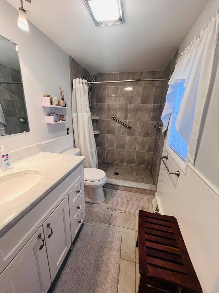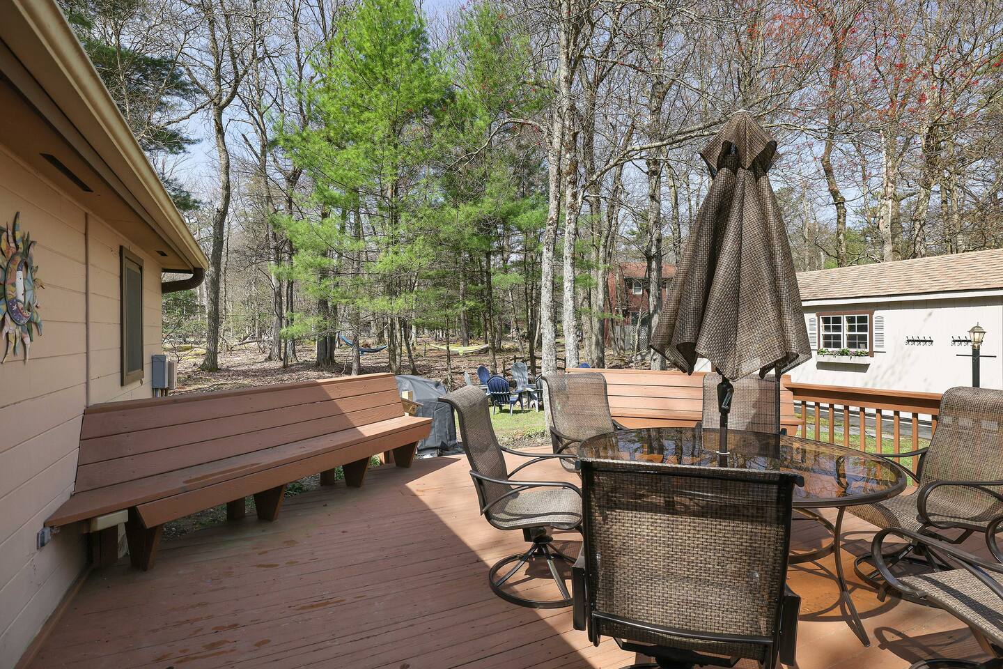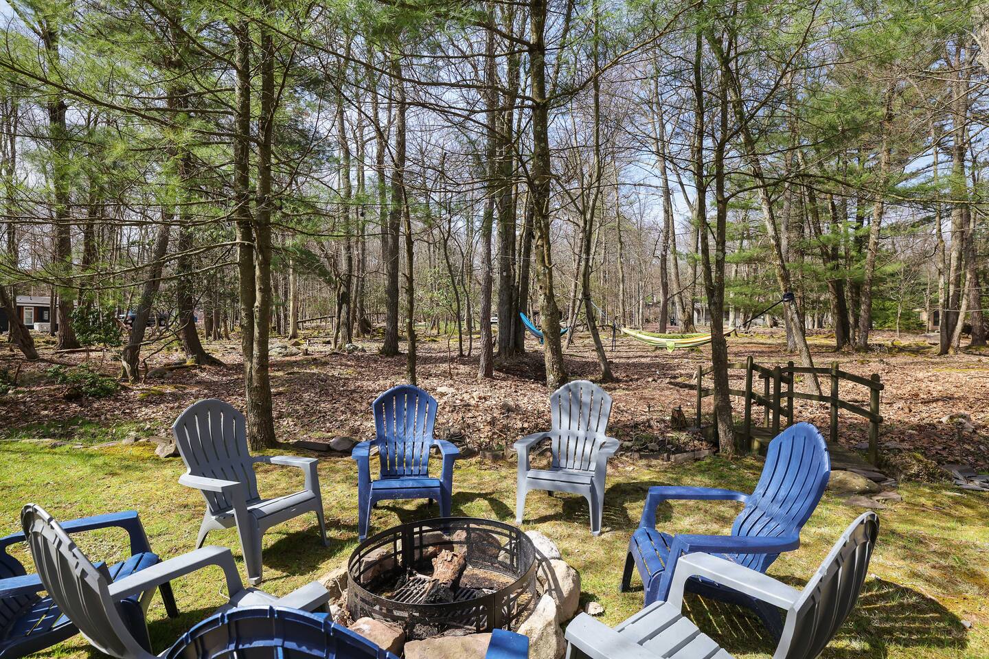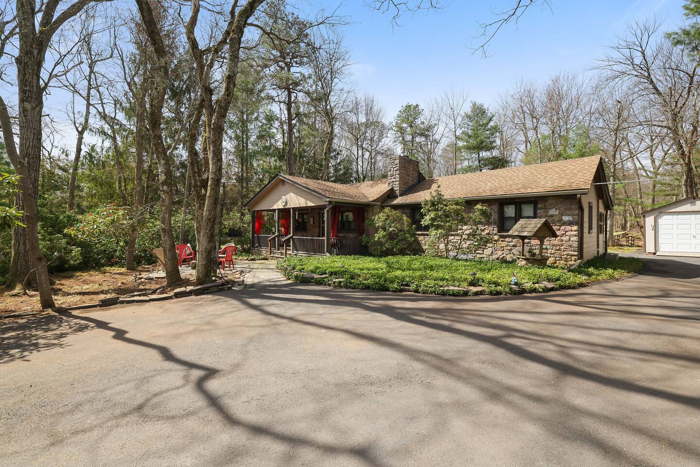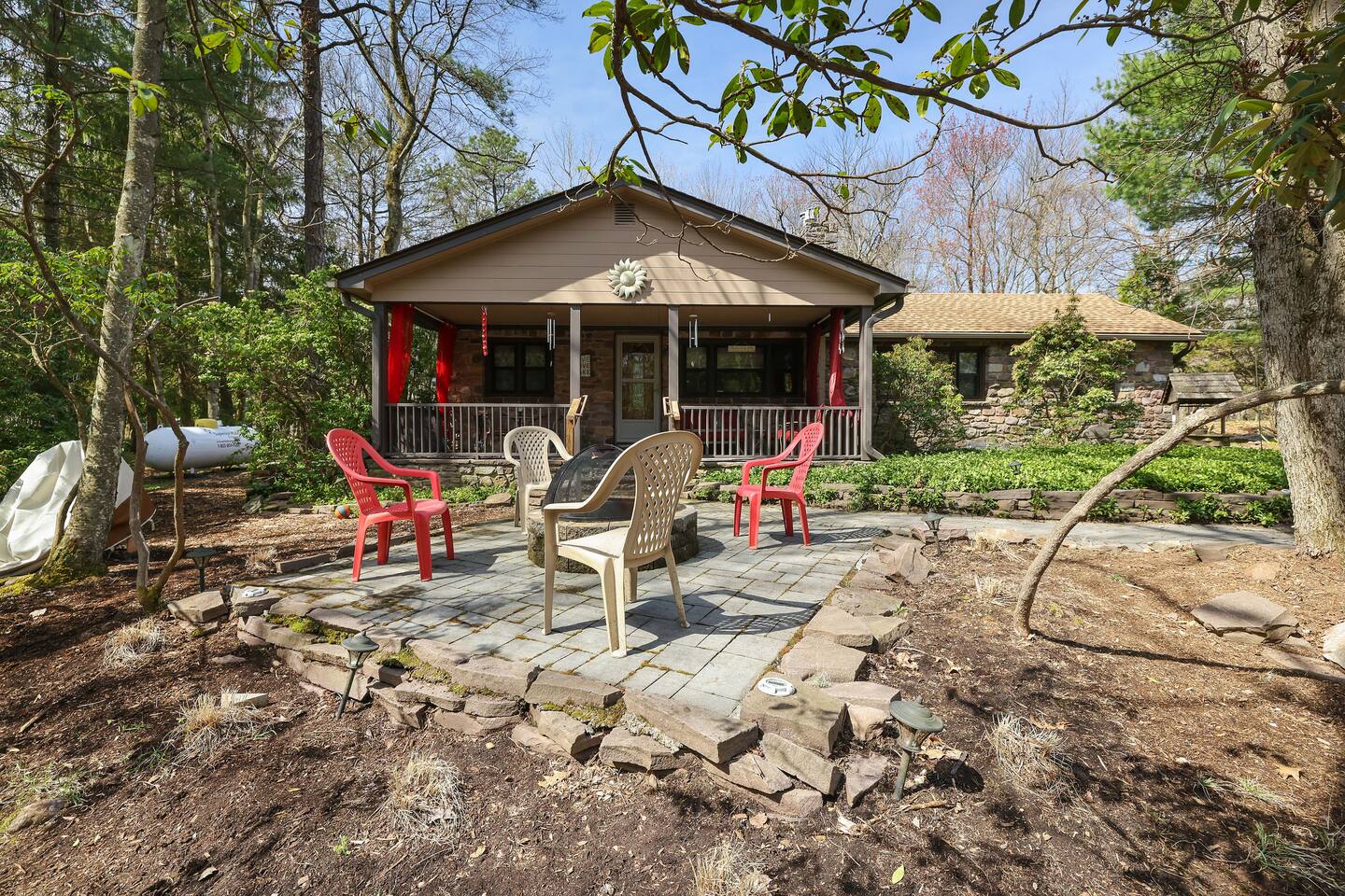 Why Youβll Love It! π Spacious Layout -Sleeps 11 w/ 4 bedrooms, 2 full baths & 2 living rooms π 6-Person Hot Tub βperfect under the stars & open year-round π₯ 2 Firepits β front & back yard π― Game Closet + Outdoor Games β board games, karaoke, cornhole, basketball, giant Connect4 πΎ Family & Pet Friendly! β ($50 per pet, per stay) π¦ Wildlife Visits β deer & turkeys & occasional bear stroll by regularly Steps to adventure!β walk to Yeti Watersports, short drive to ski slopes, golf, trails, and waterfalls The Space Bedrooms (4 total / sleeps 11) Primary Suite β Queen bed + en-suite bath (walk-in shower) Bedroom 2 β Two Full beds Bedroom 3 β Full bed + Twin trundle Bedroom 4 β Queen bed + Full bed Bathrooms (2 total) Primary ensuite with walk-in shower Hall bath with shower/tub combo (great for kids) Living Spaces Front Living Room β Smart TV, gas fireplace, comfy seating Second Living Room β huge sectional, Smart TV, stocked game closet, outdoor views Large dining table for meals & game nights Kitchen β Fully stocked with cookware, spices, coffee/tea, blender, baking sheets, and more Entertainment & Extras Board games, karaoke, cornhole, horseshoes, basketball, Xbox, Wii, giant wall Connect 4 High-speed WiFi (176 Mbps) β perfect for streaming or remote work Smart TVs in living rooms + 3 bedrooms Outdoor Fun Hot tub for 6 (open 24/7, all year) 2 firepits (wood not provided) Hammocks & outdoor dining area Gas BBQ grill Large wooded lot with boulders to explore Nearby Attractions Yeti Watersports (walkable) β paddleboards, kayaks, tubing Big Boulder Ski & Tube β 2 miles Jack Frost Ski & Tube β 5 miles Pocono Raceway β 5 miles Hickory Run State Park β 9 miles (waterfalls + free public beach) Split Rock & Jack Frost Golf β nearby Jim Thorpe β 15 miles Good to Know Must be 25+ to book; ID and rental agreement required Well-behaved, house-trained dogs welcome ($50/pet/stay) Max occupancy: 11 guests Quiet hours: 10pmβ7am (community rules) Security cameras outside only (driveway, front porch, side yard, backyard) Guest Access Self-check-in with door code at 4pm. Free parking on-site. Single-level home β no stairs inside. Come for the hot tub & firepits, stay for the laughter, games, and peaceful mountain air. We canβt wait to host you at Harmony Escape! Amy & Jessica