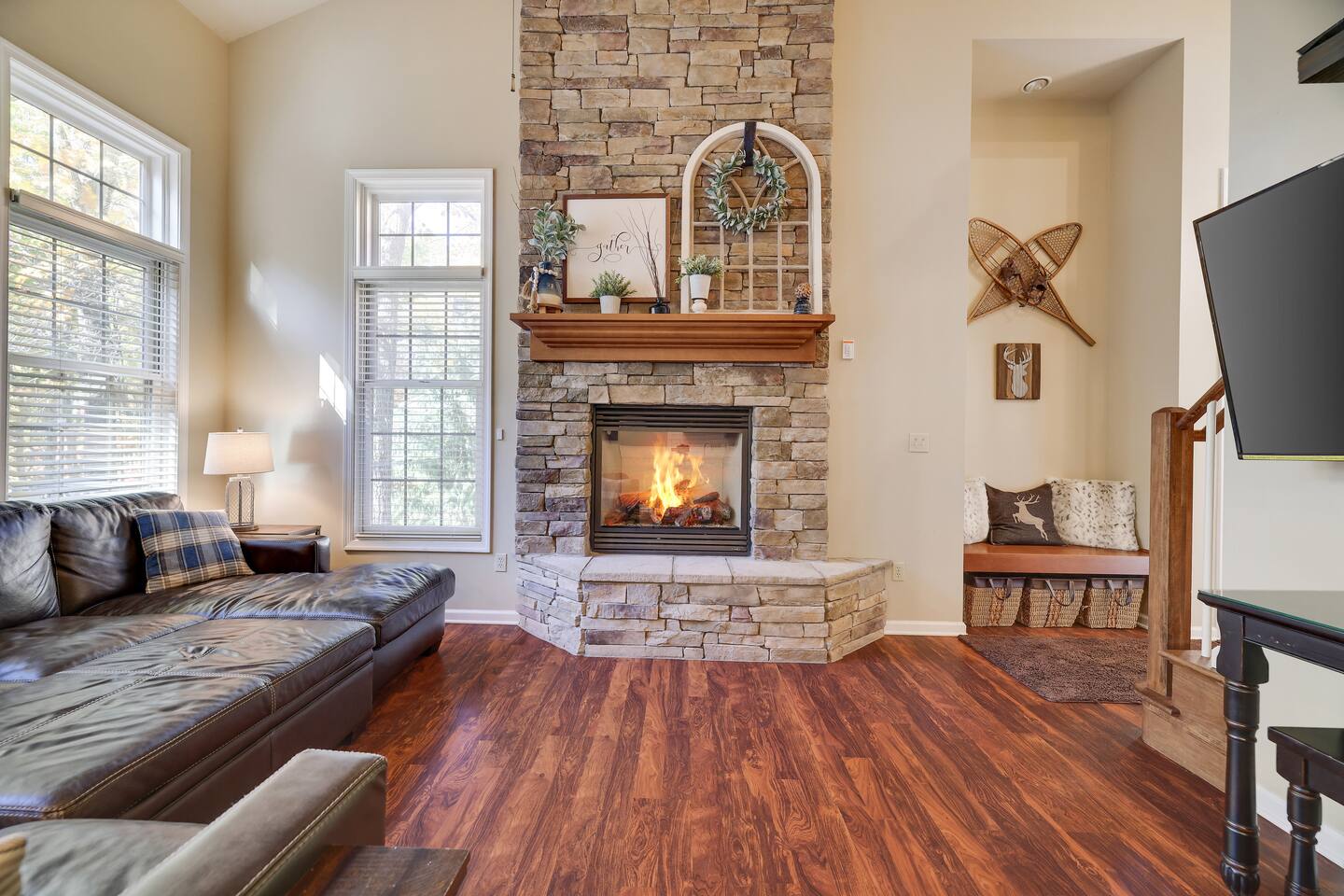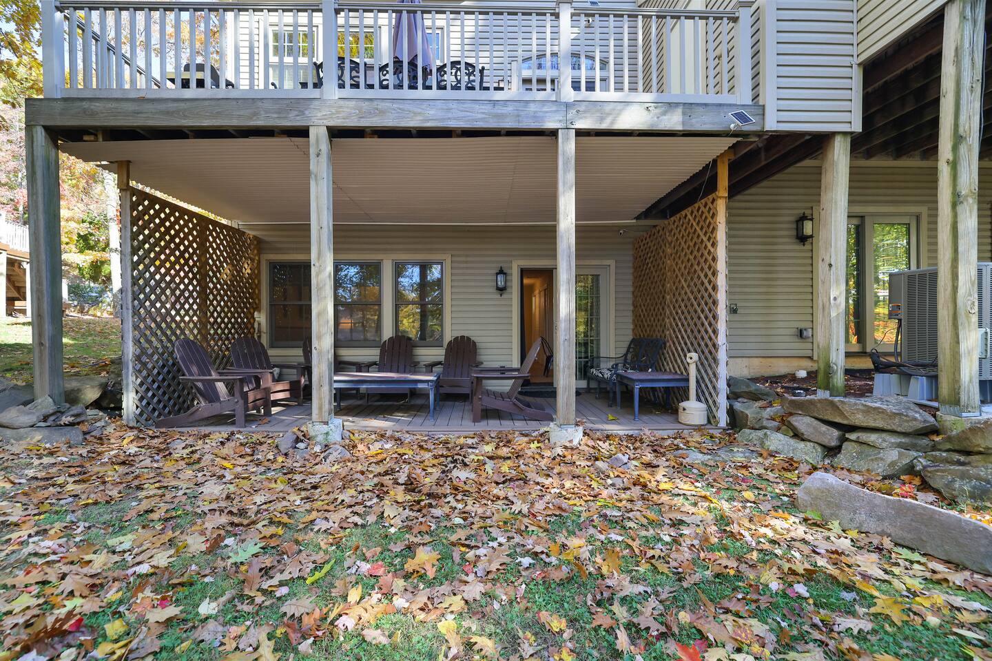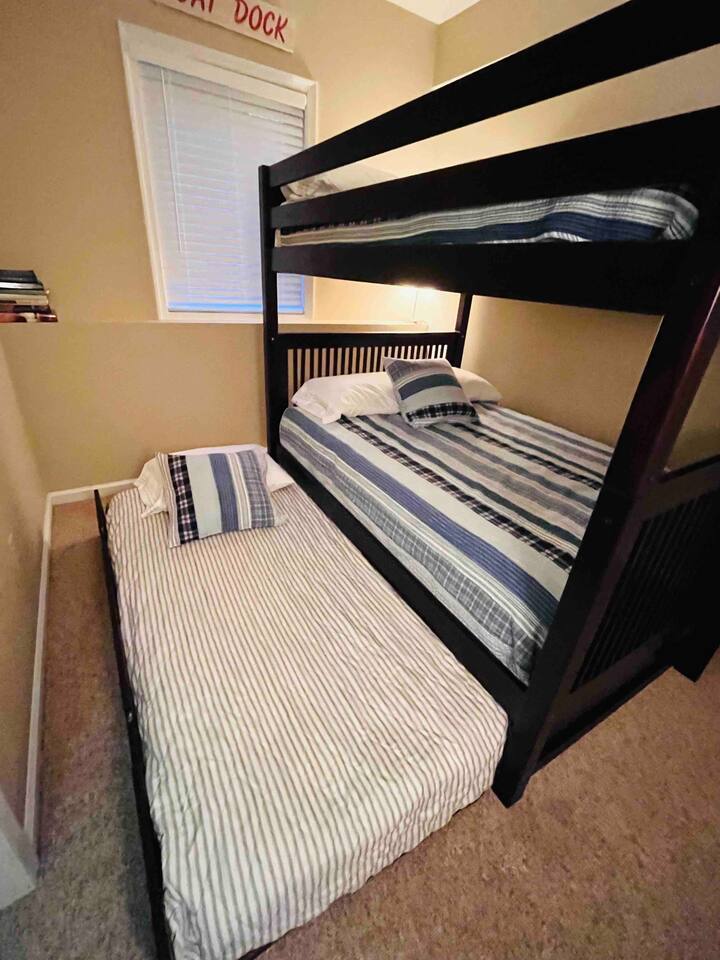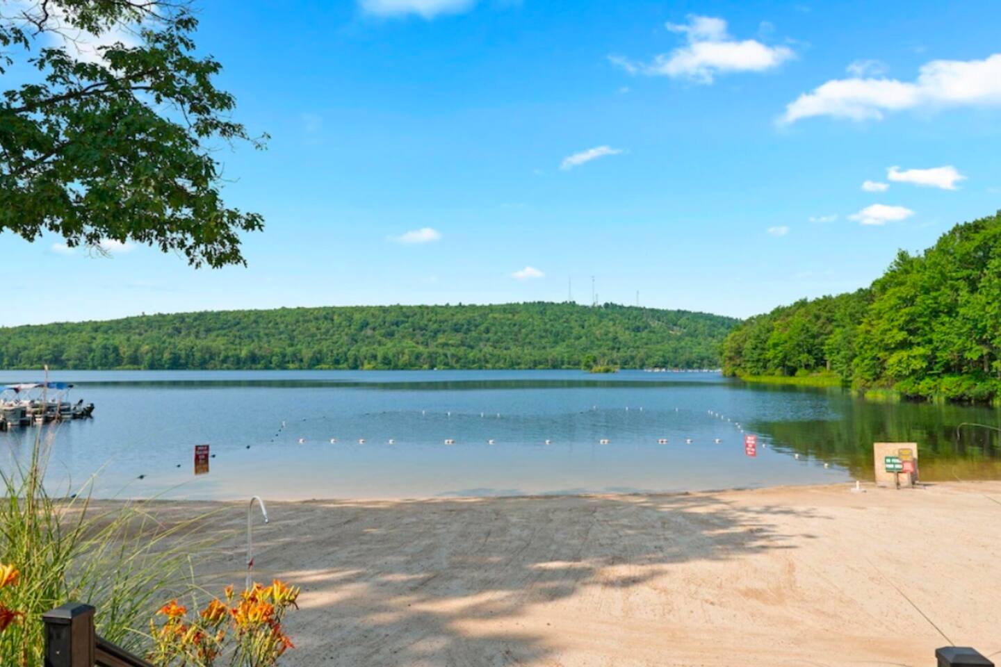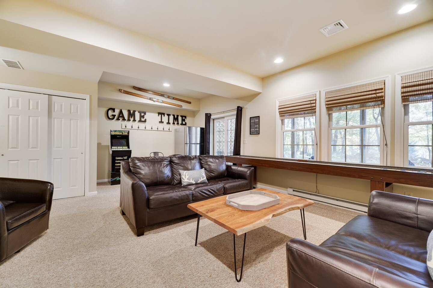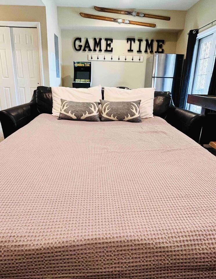 Welcome to your dream retreat in the picturesque Lake Harmony! This stunning 5-bedroom, 3.5 bathroom property provides anything you could want in a vacation spot, and then some! Step inside and be greeted by the grandeur of a two-story living room, adorned with a floor-to-ceiling stone fireplace for that warmth and coziness everyone loves in the cold months. High end kitchen appliances with large granite counterspace and everything one could need for creating special getaway meals is provided. Enjoy 2 living areas! The main floor family room has a massive sectional sofa in front of floor to ceiling windows with remote controlled blinds that will raise and lower based on the time of day for you! Large Smart TV w cable, work station area, gas remote controlled fireplace and open floorplan. The Lower level living area has plenty of seating, another Smart TV w Cable, and lots of entertainment options for everyone! Board games, 12' shuffleboard Table, GoldenTee arcade game, a 2person Arcade table with multiple game options on it. Plus a big Poker Table and full sized beer fridge if you are so inclined :) Slider doors lead you to the back yard with a covered Trex Patio and solid trex adirondack seating area complete with fire table to enjoy the fresh crisp air all year round! Television's in each room are Smart Streaming ready, with Cable TV added to the 2 living room and primary bedroom TV's. BEDROOM LAYOUT: Primary- Main floor: King bed, ensuite bath with standing shower and corner soaking tub. Room darkening blinds, Smart TV, celing fan, large closet & bureau Bedroom 2- Upstairs: Twin Beds, Smart TV, Closet, Ceiling fan Bedroom 3-Upstairs: King Bed, Smart TV, Closet, Ceiling fan Bedroom 4- LowerLevel: Queen Bed, Room Darkening Shades, large closet Bedroom 5- LowerLevel: Full over Full Bunk Bed, large closet Sofa Sleeping- pullout sofa in lower living room BATHROOM LAYOUT: Half Bath- Main Floor Full Bath- Primary Ensuite Full Bath- Upstairs- Shower/Tub combo Full Bath- Lower Level- Shower/Tub combo SUMMERTIME: • Take advantage of our 12 Boulder Lake Club passes included with your stay and enjoy the heated outdoor Pool that sits on the edge of the lake, the large beach area, pingpong, volleyball, basketball, tennis, cornhole, bocce ball and more! You can also reserve an electric Pontoon boat and kayak or setup fishing fun! Just 2/3 mile from the home, drive or walk over! (see map photo in gallery) MORE THAN A LAKE DESTINATION • Schedule your tee time at 2 gorgeous public courses, Split Rock Golf Course just 1 mile away, or Jack Frost National Golf Club, 6 miles up the road. • Waterski and water tube on Lake Harmony with Lake Harmony Watersports or take a leisurely crouise around Lake Harmony with Captain Wolf! WINTERTIME: You can't get any closer to the winter fun than here! Ski and Snowboard from morning till night at Jack Frost and Big Boulder sister mountains! Take an ATV tour, go horseback riding, try one of the 5+restaurants&bars within 3 miles from us, splash @ H2ooooh Waterpark or Kalahari Waterpark. Choose from numerous great Hiking trails, go mountain biking, paintball excursions, cach NASCAR at Pocono Racetrack! Take a train ride in Jim Thorpe or maybe just window shop and eat and drink your way thru the quaint little town. You name it, it’s all within 5-20 minutes from us! I will send you my local guide with details about local attractions and shopping once you book. We can't wait to have you!