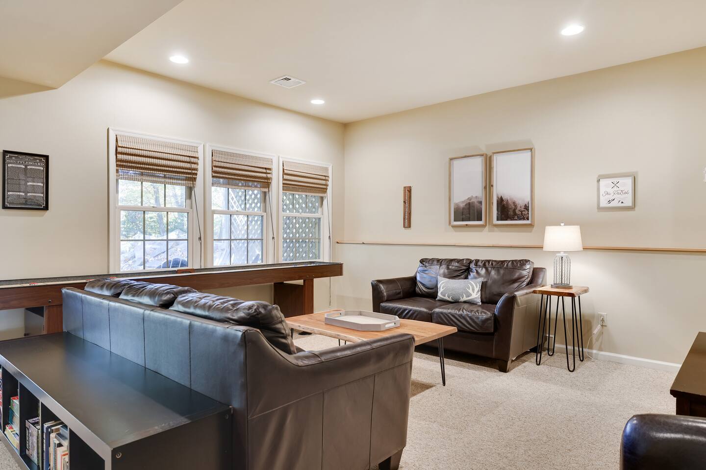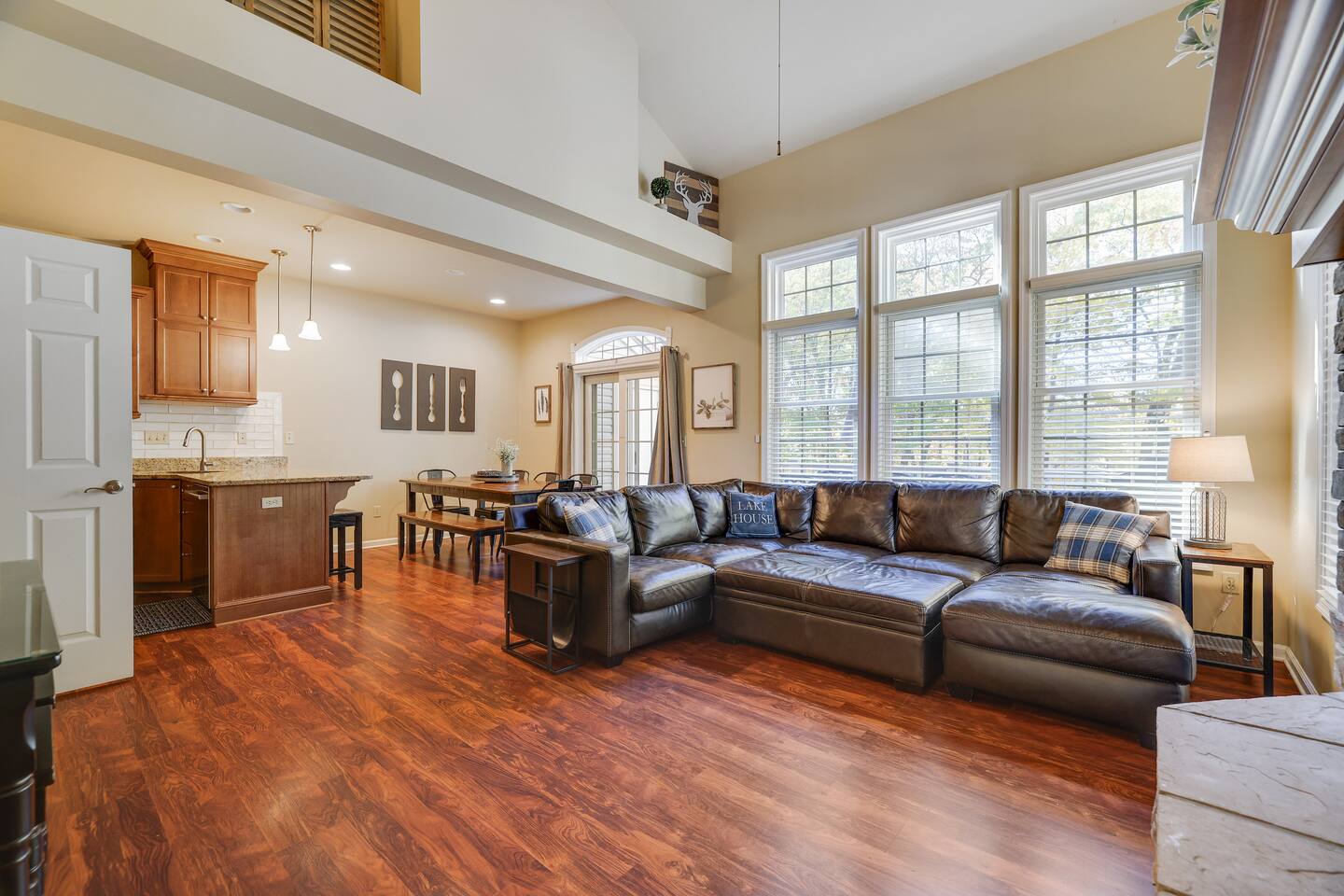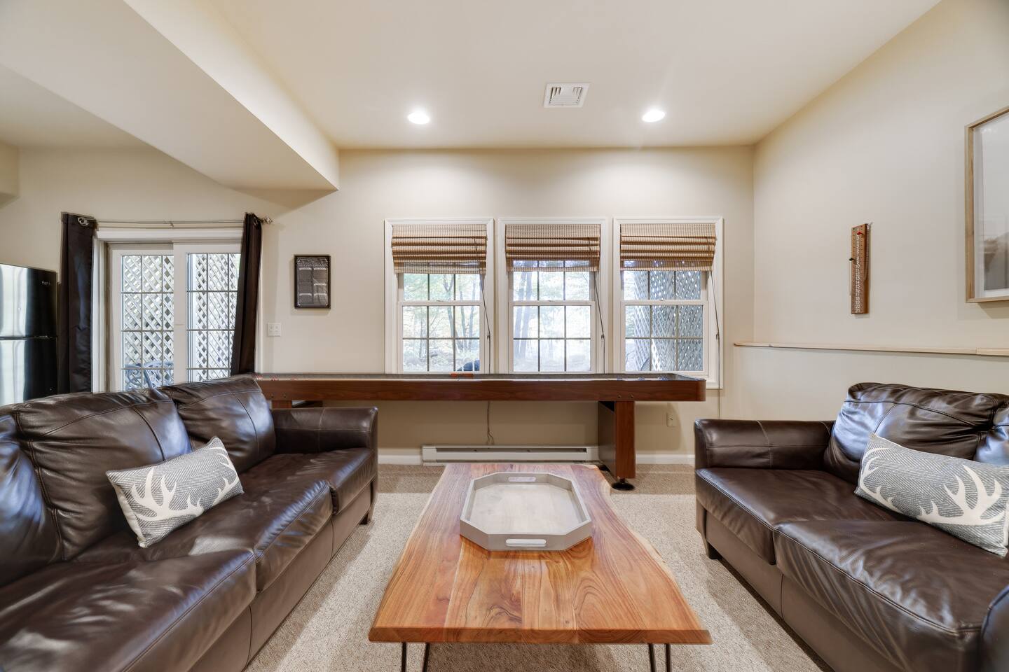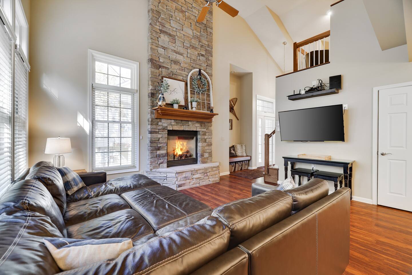 Welcome to your dream retreat in the picturesque Lake Harmony! This stunning 5-bedroom, 3.5 bathroom property provides anything you could want in a vacation spot, and then some! Step inside and be greeted by the grandeur of a two-story living room, adorned with a floor-to-ceiling stone fireplace for that warmth and coziness everyone loves in the cold months. High end kitchen appliances with large granite counterspace and everything one could need for creating special getaway meals is provided. Enjoy 2 living areas! The main floor family room has a massive sectional sofa in front of floor to ceiling windows with remote controlled blinds that will raise and lower based on the time of day for you! Large Smart TV w cable, work station area, gas remote controlled fireplace and open floorplan. The Lower level living area has plenty of seating, another Smart TV w Cable, and lots of entertainment options for everyone! Board games, 12' shuffleboard Table, GoldenTee arcade game, a 2person Arcade table with multiple game options on it. Plus a big Poker Table and full sized beer fridge if you are so inclined :) Slider doors lead you to the back yard with a covered Trex Patio and solid trex adirondack seating area complete with fire table to enjoy the fresh crisp air all year round! Television's in each room are Smart Streaming ready, with Cable TV added to the 2 living room and primary bedroom TV's. BEDROOM LAYOUT: Primary- Main floor: King bed, ensuite bath with standing shower and corner soaking tub. Room darkening blinds, Smart TV, celing fan, large closet & bureau Bedroom 2- Upstairs: Twin Beds, Smart TV, Closet, Ceiling fan Bedroom 3-Upstairs: King Bed, Smart TV, Closet, Ceiling fan Bedroom 4- LowerLevel: Queen Bed, Room Darkening Shades, large closet Bedroom 5- LowerLevel: Full over Full Bunk Bed, large closet Sofa Sleeping- pullout sofa in lower living room BATHROOM LAYOUT: Half Bath- Main Floor Full Bath- Primary Ensuite Full Bath- Upstairs- Shower/Tub combo Full Bath- Lower Level- Shower/Tub combo SUMMERTIME: • Take advantage of our 12 Boulder Lake Club passes included with your stay and enjoy the heated outdoor Pool that sits on the edge of the lake, the large beach area, pingpong, volleyball, basketball, tennis, cornhole, bocce ball and more! You can also reserve an electric Pontoon boat and kayak or setup fishing fun! Just 2/3 mile from the home, drive or walk over! (see map photo in gallery) MORE THAN A LAKE DESTINATION • Schedule your tee time at 2 gorgeous public courses, Split Rock Golf Course just 1 mile away, or Jack Frost National Golf Club, 6 miles up the road. • Waterski and water tube on Lake Harmony with Lake Harmony Watersports or take a leisurely crouise around Lake Harmony with Captain Wolf! WINTERTIME: You can't get any closer to the winter fun than here! Ski and Snowboard from morning till night at Jack Frost and Big Boulder sister mountains! Take an ATV tour, go horseback riding, try one of the 5+restaurants&bars within 3 miles from us, splash @ H2ooooh Waterpark or Kalahari Waterpark. Choose from numerous great Hiking trails, go mountain biking, paintball excursions, cach NASCAR at Pocono Racetrack! Take a train ride in Jim Thorpe or maybe just window shop and eat and drink your way thru the quaint little town. You name it, it’s all within 5-20 minutes from us! I will send you my local guide with details about local attractions and shopping once you book. We can't wait to have you!