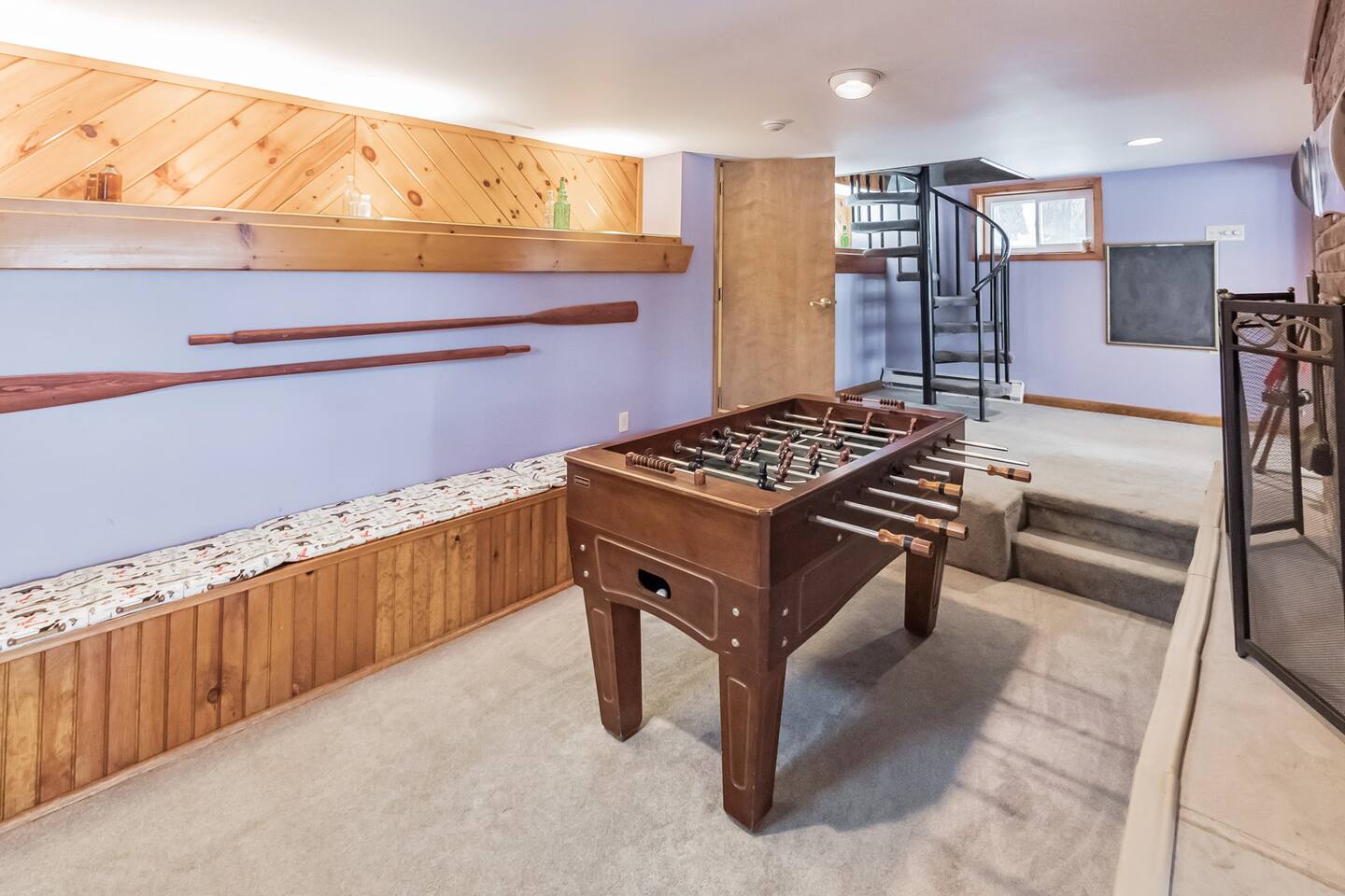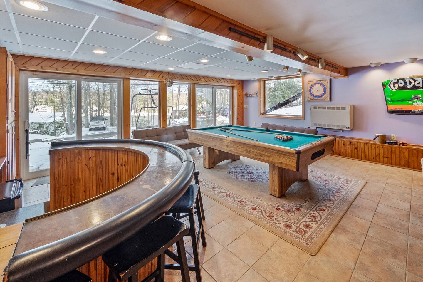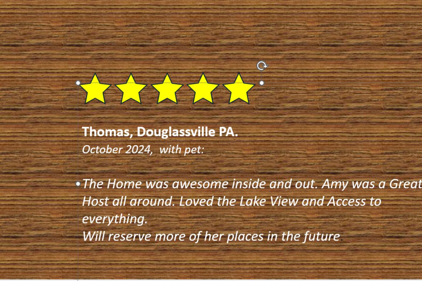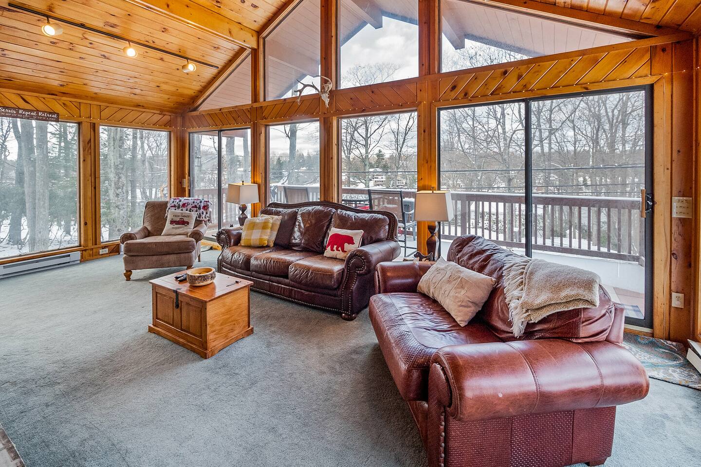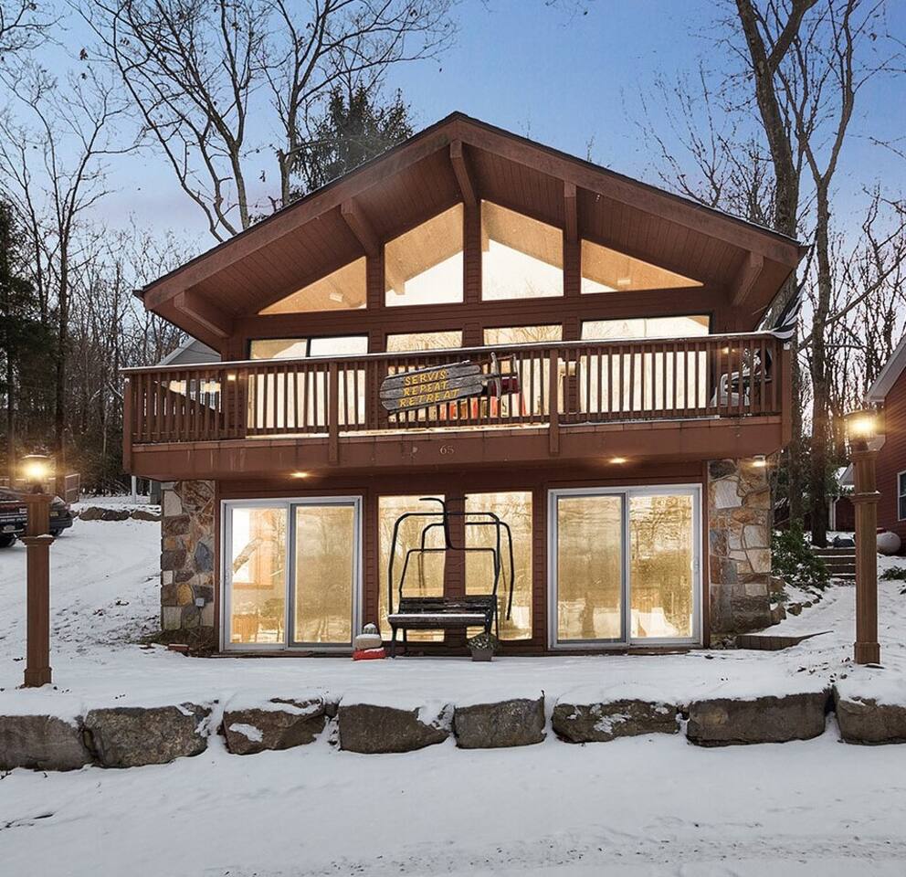 This Lake Harmony Chalet is one of a kind! Located directly across the street from the lake with water views! Glass frontage gives you the ultimate chalet feel year round. REPEAT RETREAT has so much to offer you and yours! Living Space: Gorgeous wood beams, ceilings and walls will surround you in the upstairs living area. Open concept space holds a double sided gas fireplace connecting the living area with the dining area. Above the fireplace is a 42 inch Smart TV, 2 sliding doors to the upper deck looking out at the lake, plenty of seating, games, and even a computer desk w 2nd monitor. DINING SPACE: Off of the kitchen is a large dining table with space for 12. Situated next to the gas fireplace, its a great spot for all meals as well as game nights! KITCHEN: The kitchen is not your usual Pocono rental kitchen. Stainless steel gallery appliances set off the granite counters, real wood cherry cabinets and vaulted ceilings w sky lights make for a great cooking experience. Everything you could need to create family meals is here for you including stovetop and bakeware, plating for 12+, Crab pot, Ninja coffeemaker w frother and single cup capability, 4 slice toaster and more. BEDROOMS: The home sleeps 13 comfortably *Primary: The oversized master bedroom includes Queen bed, a step up jacuzzi tub (not to be confused with a hottub), 42 inch smart TV , Heat and AC Split unit, Large glass windows surround the french door leading to the rear yard and waterfall area, and en-suite bath . *The secondary bedroom has 2 large, super solid wood double over double bunk beds with sturdy wooden steps for top bunk access. Double closets, bureau, and Heat/AC split unit. *The third bedroom has a single bed over full bunk bed, closet, bureau and Heat/AC split unit BATHROOMS: *The En suite Master bath has marble floor, marble counter, separate water closet and full floor to ceiling marble shower. Opt to warm up the floors in the chilly months with the blown heat on the floors and towel warmer. *Guest hallway Full Bath has a standing shower, towel warmer, hair dryer and marble floors *Gameroom half bath is located downstairs at the bottom of the spiral staircase. GAMEROOM/BAR: *Take the party downstairs to the game room! Make a cocktail at the sunken bar with mini fridge with seating for 6. Have fun playing pool, ping pong or challenge your mates on the 60game ARCADE table for 2! Another 40 inch smart TV with all the streaming apps sits above the dual sided gas fireplace. OUTDOOR AREAS: *Enjoy the backyard Beer Garden themed patio, including firepit, picnic table and working waterfall! Overhead garden lights complete the ambiance. *Have your coffee or afternoon beverage out on the front patio overseeing the lake and passerbye's Summertime: In the summertime, Repeat Retreat provides access to the lake via a private point just yards from the home. It's a great spot to get wet and have some fun! (see photo's of Lesher Street and the map in photo gallery) This is a beautiful home with a lot of features you don't see in usual Pocono Rentals. No Paneling here! Local Notables: WALK to Nick's Lakehouse/Shenanigans/Piggy's Restaurant/TerraCotta Restaurant/ Hogg's Heaven IceCream/ Lake Harmony Watersports/ Lake Harmony water tours / Country Peddler Market Lake Harmony isn't just about the lake... we are minutes from white water rafting, paintball skirmish, Hickory Run State Park with it's hiking trails, waterfalls and a large free beach, Boulder Field (so cool!), Pocono Raceway, ATV rentals, and so much more! Well behaved furry family members are welcome Crib, and High chair rentals are easily available, just ask! Don't miss this home for your next getaway! Amy Servis Guest Requirements *Smoking outside only- no butts left behind *Must meet age requirement 25+ w proof of ID *Must sign rental agreement sent via our guest portal *Pets kept off furniture without coverings brought from home *Pet fee is per-pet/ per stay $50 PS: If this home isn't available for your desired dates, please ask me about the 12+ others I have in Lake Harmony/ Big Boulder!